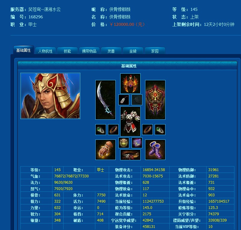 No.8 潇湘水云 【侠骨悸卿颜】 46W装评 售价12W 大甲士之一,血防攻击抗性等属性都已经做得十分的不错,对于如今甲士属于高端副本必备、PK恶心死人的定位,这个甲士已经相当不错。当然,还是有人会感叹“可惜是个甲”了。
