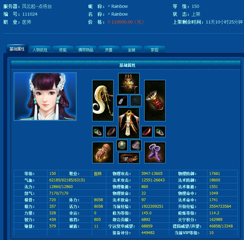 No.11 点将台 【〃Rainbow】 装评45W 售价11W 45W的大神奶,6W血,但是没到2W的双防,抗性方面做得不错,补天满包,52级的悬瓠济世,还有一包的敏捷金斗,敏捷方面堆得还是十分出彩的。还有珍稀的兔儿爷坐骑。