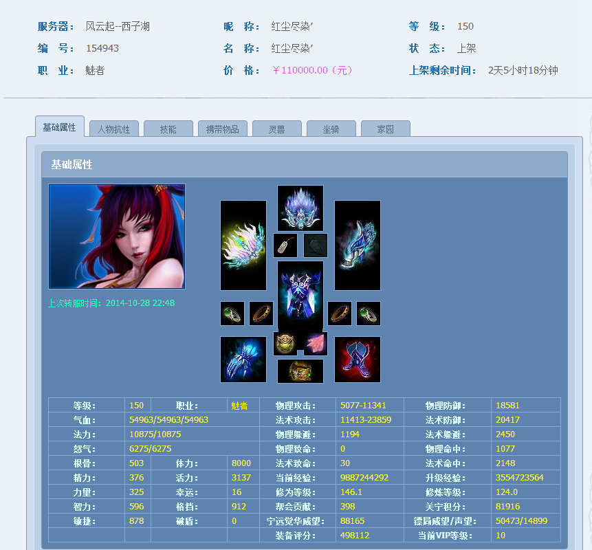 Top9 红尘尽染′ 150级魅者 装评50万 售价11W 大神魅者,属性完美装备齐全,现阶段魅者们受限于装备和石之灵的属性需求,50W已属顶级行列。