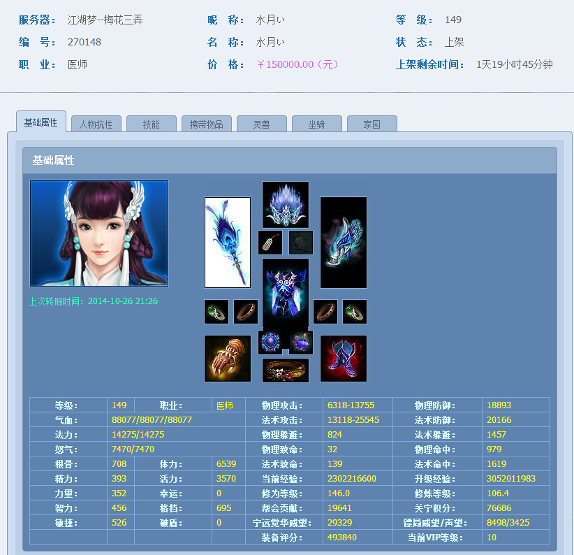 Top8 水月ぃ 149医师 装评50万 售价15W 夫妻党卖号,转服四的大神奶妈,没有家园,抗性完整,现阶段医师还是不可或缺的比武队主力。