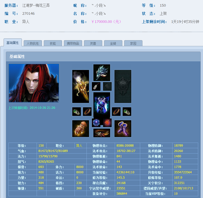 Top6 ゛.小段ゝ(火月) 150异人 装评58万 售价17W 梅花三弄夫妻档大神的异人号,五级套大神极品属性,传家宝家园和百修灵兽齐备,的确是当前异人藏宝阁上最佳的大神号。