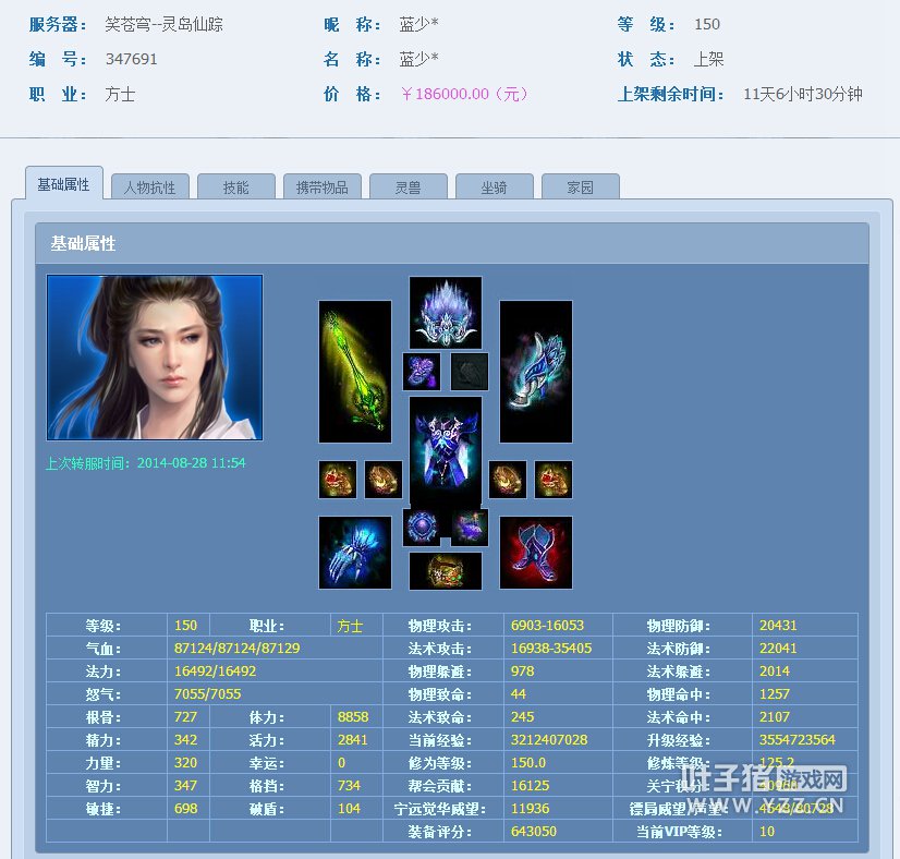 Top5 蓝少* 150方士 装评64(70)万 售价18.6W 老牌大神龙帅的号,实际评分应该是70W+的,完美五级套大神,转画魂什么的简直是顶尖胚子