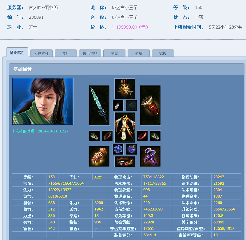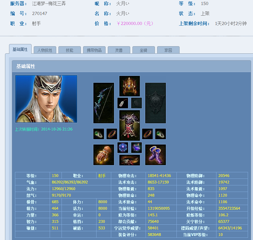 2015年1月本年度第一期的藏宝阁大神账号盘点,带你看看藏宝阁上有哪些土豪大神的号出售。 >>>>>点击进入倩女幽魂2藏宝阁角色搜索器<<<<< Top10 Mars画笔墨 150级画魂 装评49万 售价10W 新一代亲儿子上架藏宝阁,50W的画魂战斗力足以与60W+的其他职业媲美,只卖10W,省去买方士号重新打造的苦恼,武器、传家宝、修炼等全部都打造好了,买了就可以去秒人了有木有。 Top9 红尘尽染′ 150级魅者 装评50万 售价11W 大神魅者,属性完美装备齐全,现阶段魅者们受限于装备和石之灵的属性需求,50W已属顶级行列。 Top8 水月ぃ 149医师 装评50万 售价15W 夫妻党卖号,转服四的大神奶妈,没有家园,抗性完整,现阶段医师还是不可或缺的比武队主力。 Top7 風雲ゝ暗衣゛ 凌霄宝殿 装评55万 售价16W 大神暗衣继续呆在藏宝阁上,虽然光从属性来说的确是几年的老号完美的属性,但鉴于现阶段刀客PK的片面性,想要成功售出还需要有缘人。 Top6 ゛.小段ゝ(火月) 150异人 装评58万 售价17W 梅花三弄夫妻档大神的异人号,五级套大神极品属性,传家宝家园和百修灵兽齐备,的确是当前异人藏宝阁上最佳的大神号。 Top5 蓝少* 150方士 装评64(70)万 售价18.6W 老牌大神龙帅的号,实际评分应该是70W+的,完美五级套大神,转画魂什么的简直是顶尖胚子 Top4 い迷宫小王子 150方士 装评58万 售价19.9W 小王子后来在羽林郎从新打造的号,相比起前者血防少了躲避高了,在该区已经是非常出色的大神方士,同样是画魂的顶级胚子。亮点是包包里不少绝技。。。 Top3 闪ω闪 148射手 装评65万 售价 20.1W 攻击4.5万五级套大神射手,在豪情痴服务器,家园灵兽法宝值得一看 Top2 火月ぃ 梅花夫妻档第三个号,本大区的超级射手之一,对比上一个攻击稍低,但其他属性也接不上,价钱有点高。 Top1 Iceん姜珊珊 150医师 装评66万 售价29W