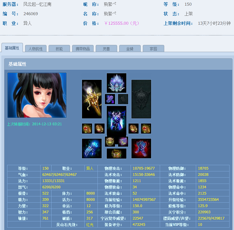2015年2月第十九期藏宝阁大神账号盘点,有的玩家打算卖号换点钱过年,也有玩家拿到年终奖计划买个号好好玩,下面小编带你看看藏宝阁上有哪些土豪大神的号出售。 >>>>>点击进入倩女幽魂2藏宝阁角色搜索器<<<<< No.10 浮世造梦 沧海诸神 150级画魂 装评55万 售价10.1W 大神级别画魂,如今如日中天的画魂成型号实在是物有所值,四级套双绝技,传家宝等全部打造完毕,作为一个新太子,是一个好的苗子。 No.9 醉里秋波丶 长相思 150级刀客 装评54万 售价11.1W 大神刀,2.3W双防,完美的刀客属性,在古人吟大区算得上数一数二刀客,极致的抗性与技能修炼,灵兽家园等等全部齐备,不可多得的刀客大神号。 No.8 「VaIued」の大宝 潇湘水云 149级魅者 装评44万 售价11.6W 超级魅者,标配双无妄想武器,虽然由于职业需求评分较低,但是实力不容小觑,最恶心的魅者,抗性与强控俱佳,能够轻松担当控场小能手的重任。 No.7 飛絮ぺ 忆江南 150级异人 装评47万 售价12.5W 一身奇葩的物躲装备(不是法躲哦),双手异人,技能法宝传家宝齐全,唯一缺憾在于没有家园。 No.6 Dragonメ穆勒 双飞燕 150级甲士 装评56万 售价15W 大甲哥,纯根骨甲,10万的血3万双防4万攻击屌炸天,带法宝全元素抗250+,一等一能扛,但是如果想要转型提升点攻击,则还要加以改造。 No.5 天使物语♀珊珊 灵岛仙踪 150级医师 装评53万 售价15.3W 4+5级套土豪医师,比武标配神奶妈,抗性防御一流,一切物品全部齐备,买来就能玩 No.4 い迷宫小王子 羽林郎 150级方士 装评58万 售价18W 在该区已经是非常出色的大神方士,转职画魂的顶级胚子。亮点是包包里不少绝技。。。 No.3 ╰★Sugar@惜 沧海诸神 150级医师 装评53万 售价20.1W 另一个比武土豪奶妈,完美5级套,更强的属性,全齐全的切装,而且更重要的是带了家园,角色很完整。 No.2 火妹妹 西子湖 150级射手 装评61万 售价25W 无需多说,名人射手,传说般的存在,攻击、致命、法躲等都属于顶级水准。火妹妹的号挂在CBG很久了,有意者可以洽谈价格。 No.1 Iceん明月 西子湖 150级射手 装评70万 售价29万