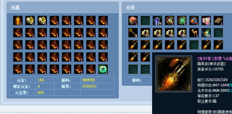 No.10 单刀会 咪咪ゝ 150医师 装评47万 售价10.8W 2W不到的双防有点强差人意,抗性尚可,背包备齐了所有需要用到的切装,但在单刀会本服已经是一个优秀的比武医师了,最重要的灵兽家园全部齐全,轻松上手。 No.9 烽火佳人 凯歌 150级画魂 装评56万 售价11W 方士转职画魂,很可惜武器也没换掉,属性上强是强了,但是120绝技还没学到,49级蝴蝶伤害力优秀,包裹里全是土豪抽废的武器,看来买回去后打造兵器还是要更久更耗钱啊。 No.8 双飞燕 黯然.. 150级射手 装评55完 售价15.6W 极品射手行列,4.8万攻击,双锋锐不可修5+4级套装,14级家园就在包包里,也是一个完整的代表。 No.7 射雕英雄 九朝╰° 145级方士 装评59万 售价16W 武林主少见的大号大神,竟然是加点根骨比较多,而且气血值也较低,在本区内还算不错。 No.6 忆江南 没辙ぺ 150级甲士 装评55万 售价16W 标准的沙包根骨甲,高抗高防御,攻击力实际上也不太差,没有家园。 No.5 仙剑问情 托尼 150级射手 装评54万 售价21W 全倩女排前三的9500攻击神兵弓,高达5.2W的物攻,非法躲流的纯输出射手,如今的职业平衡来看虽然暴力,但是自己也是脆皮一个。 No.4 灵岛仙踪 坏坏 147级射手 装评61万 售价16W 老牌的大神射手,55级的蝎尾,4.5万给力的物攻,但是在属性方面稍微倾向于法躲流,生存能力不错。 No.3 羽林郎 リ我干跌、 150级画魂 装评54万 售价19W 首席亲儿子画魂,已成型的双手鬼器画卷,接近4万的攻击,走纯法躲流,极品的家园传家宝和灵兽,想要体验极致的画魂PK,当属这类型的大神画魂号最好了。 No.2 沧海诸神 惜惜(唸桐) 150级医师 装评53万 售价20W 封测沧海诸神区的老牌大神了,五级套属性发展完美,有抗性切装和技能切装,当仁不让的比武优秀奶妈。 No.1 潇湘水云 浮帅。 150级刀客 装评64万 售价20W