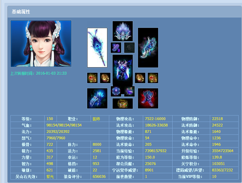 Top3、医师 「Sweety」の圈圈 服务器:风云起--点将台 装评:65w 价 格:¥188888.00(元) 5级套紫光奶妈,虽然没有带有家园,但是满补天,各种双抗百分比首饰,百修护身龙宝宝以及特殊坐骑,还是能够值回票价的,而且该医生正装元素抗性和控制抗性本身就不低。 |