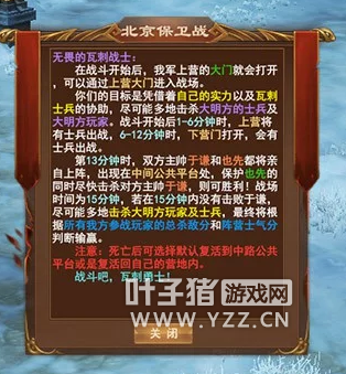 1.进入北京保卫战战场:当土木堡突围战场结束后,玩家均会被直接传送进入北京保卫战的战场,进入后,则可看到一段北京保卫战的战斗动画。 2.准备阶段战场介绍:进入战场二后,有一个5分钟的战场准备阶段,准备阶段期间,双方玩家可仔细阅读战场的介绍。 3.营地出兵:战斗开始后1—6分钟,明军方安定门和瓦剌方上营的大门都会打开,玩家需要从此处出去。此外,在中间上路区域附近,双方都会出兵,双方士兵会在中间区域内互相战斗。玩家前往协助击杀敌方士兵,将会获得战场士气值。而在6—12分钟时候,明军方安定门和瓦剌方上营门将会打开,上路的士兵将停止发兵,下路中间区域的士兵将出战。因此,双方都要尽快地在规定的出兵时间内,去尽可能多地击杀敌方士兵,错过时间后,这些区域都将不会出兵,击杀的士兵少了将会影响到本方最后的战场胜负及奖励判定。 4.主帅出战:在战斗剩余5分钟时,双方主帅都会出现在中路附近区域,但尚不可攻击。在双方主帅周围进行战斗,会更有利于主帅所属的一方玩家。主帅会对周围的敌方玩家造成一些负面效果,例如减速、流血等。因此,在战斗剩余5分钟时,依靠自己方的主帅,将是争夺中间公共平台最大的倚仗。在战斗剩余3分钟时,双方主帅将变得可被攻击,且会协助玩家一同去争夺中间公共平台这一重要战斗枢纽。 5.北京保卫战战场结束:在15分钟内,任意一方的主帅若死亡,则另一方将获得胜利;若15分钟内,双方主帅都未死亡,则将根据杀死敌方士兵的数量及玩家的杀敌分之和来综合判定战场输赢。战场结束后,玩家将分别获得风云战役威望和声望,同时,战绩排名前90%的玩家将可获得圣战令。 了解更多相关信息,请前往http://qn.yzz.cn/ [编辑:犀利摇]