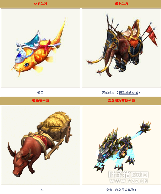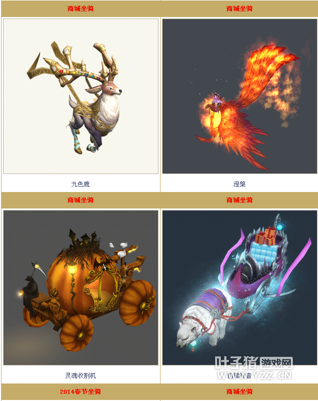 新倩女节日特殊坐骑大全 你都见过吗? 在倩女里什么是土豪的象征?玉如意?NoNoNo! 玉如意在双倍充值过后,已然不算什么大神标配了。爱美之心人皆有之,可倩女没有多少特殊时装啊! 顶多也就高高挂在商城里那些,明码标注了的精美时装。有钱就可以拥有!而且还是无限制的! ┑( ̄Д  ̄)┍ 所以时装也out了。究竟什么才是大神的标配呢? 请问:这个世界上什么最珍贵? 答:独一无二! 是的,哪怕倩女无法真正做到独一无二,也会想方设法保持固定产量。而这些看似珍贵让大神们趋之若鹜,让贫民可望不可即的东西,究竟是什么呢? 当当当当~那就是……特殊坐骑! 接下来就让我们来瞧瞧,那些让贫民捏碎了荷包也想拥有,让大神们疯狂砸钱,也想收入囊中的,美轮美奂的特殊坐骑吧! No.1 名字:圣诞雪橇 (圣诞节) 2011年12月23日8:00-2011年12月25日24:00 (小编:感觉小编还是蛮厉害的,脑海里总能浮现相应的曲子,比如:Twinkle, twinkle, little star,How I wonder what you are. ) 你个智障,那是小星星! No.2 名字:九霄腾龙 (上元节) 时间:2012年2月6日(正月十五)0:00时-23:59 (小编:小编爱看神话故事,对龙有着难以启齿的……哔……) No.3 名字:灵蛇献瑞 (蛇年专属坐骑) 时间:2013年2月16日12:01至23:59 No.4 名字:龙舟 (端午节) 时间:2013年6月9日-2013年6月15日 (小编:以小编的审美,这龙舟,不是一般丑啊!我喜欢楼上的龙啊!) No.5 名字:风行 时间:2013年10月1日0点-10月14日23点59分 (小编:大风车吱呀吱悠悠的转这里的风景啊真好看 ~) No.6 名字:天龙马 (除夕夜) 时间:2014年1月30日20点起至2014年1月30日 (小编:小编是个汉子心妹子身,这个天龙马满足了小编对于御姐or汉子的坐骑配置幻想。简直帅炸!) No.7 名字:鸳鸯于飞 (浪漫情人节) 时间:2015年2月10日——2月14日 (小编:喂,妖妖灵嘛?这里有人公然撒鸟粮,什么?不是狗粮你们就不管?(╯’ - ‘)╯︵ ┻━┻) No.8 名字:五猴来福 时间:2016年2月1日00:00起至2016年2月16日23:59分 (小编:我一次孙大圣都没化生出来过,我拒绝看这个坐骑!我心酸!) No.9 名字:三羊开泰 (除夕活动) 时间:2016年2月12日-2016年2月27日 (小编:我喜欢这种毛茸茸的!!!的羊???等等,这明明是草泥马!哪里是羊了!KFZ你粗来!我们好好争辩一下!) No.10 名字:五谷丰登大牛车 (五一劳动节) 时间:2016年4月30日00:00—5月4日23:59 (小编:不愧是贴合节日气氛,五一五一劳动最光荣啊!不过…… 牛郎!你家牛被KFZ拐跑了!速来啊!!) No.11 名字:纸鸢 (仲夏大冒险) 时间:2016年6月27日—2016年7月21日 (小编:飞行坐骑什么的,果然还是很帅的样子!小编忽然想去放风筝了。来追我呀~) No.12 名字:黄金鬼轿 (暑期中元活动) 时间:2016年8月4日-2016年8月18日 (小编:这通体上下用24K纯金打造的轿子 无处不凸显出轿主的尊贵的杀马特王霸之气啊! ) No.13 名字:兔儿爷 (中秋活动) 时间:2016年9月8日—9月18日 (小编:讲真啊,这大个的兔子,嗯……大家觉得红烧好呢,还是清蒸呢?) No.14 名字:猪刚鬣 (国庆节) 时间:2016/9/29-2016-10/71 No.15 名字:小虾溜蛋 时间:2017年1月4日14:05—23:59 (小编: 嗯……我觉得……油焖大虾好吃!!!!!) No.16 名字:挽墨醉雪 时间:2017年1月4日14:05—23:59 (小编:杜鹃衔着海棠花篮,里面同坐一对恋人。怎么想怎么美啊~) No.17 名字:团圆咕咕 (鸡年新春) 时间:2017年1月19日—2月9日00 (小编:哎呀妈呀,这跑起来,小短腿吧嗒吧嗒的。萌化了——) 当然除了以上这些节日坐骑外,还有别的特殊坐骑,在这里小编就不一一介绍了。 别急…… 跟着小编的步伐,一起围,那些年!倩女幽魂公布的特殊坐骑吧! [编辑:犀利摇]
