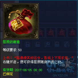龙舟竞渡 活动时间 正式开放:2017年5月25日—5月30日12:00—23:59 参与条件 角色等级≥50级,领取任务后三人及三人以上组队报名。 领取次数 每天一次。 活动奖励 经验、五色丝线、御赐假日专享、端午巧粽等。 活动介绍 龙舟竞渡本源于楚国百姓不忍屈原自尽,于汨罗江上争先恐后划船前去相救。后经千百年流传,已成端午节纪念屈原之民俗。 1.端午活动期间,可在各大主城屈原的鬼魂处领取[端午]龙舟竞渡任务,再次与之对话报名,系统将会为你进行一分钟的匹配,若匹配到竞赛队伍,则与该队伍共同进入副本;若匹配不到竞赛队伍,一分钟后会自行进入,可独立完成该副本。