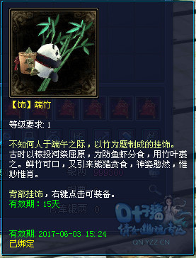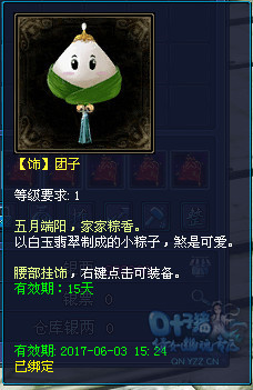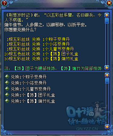 端阳佳礼 五彩丝线 端午节活动中,集齐一定数量的五彩丝线,可以换取端午节特殊挂饰:【饰】团子和【饰】端竹,以及可爱的变身丹。打开【饰】团子礼盒、【饰】端竹礼盒更有机会获得90天挂饰。 端午巧棕 集齐一定数量的端午巧粽还可以兑换一捆秘色瓶宝箱、逢端午·皇城恩赐令。 端午节礼券 在端午节活动中有机会获得端午节礼券,在6月5日14:00之前交给杭州苏堤旁的白娘子,即可在6月5日14:05—23:59期间领取到龙舟、雪米团子、五色土、宝匣钥匙等珍贵礼物。 更多倩女资讯,尽在叶子猪倩女幽魂。 [编辑:辰辰]