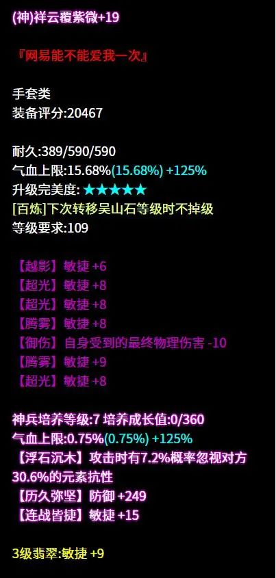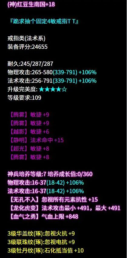 今日出游,至逍遥观 本想找紫萍姐姐一起玩耍 但和紫萍姐姐相见前 一位109级的老方吸引了倩的注意 潇洒的身影,凌厉的招式 眼前一亮的不止路边的小怪 还有我!!! 少侠!倩想拜你为师! 求您传授我变强秘诀! 昵称:二等饼干° 职业:道法方士 等级:109级 区服:[千古风流] 帮会:梦醉江湖 (以下数据来源于邮箱投稿) 逆天神赐+双最大+方士之魂 +智力+法术攻击+沉默抗 石之灵·悟则圣加强攻击 真正的误闯天家 是对手懵懵懂懂拿着武器 却在战场遇到了手持木剑的大大 七绝四法躲+三敏的布盔 曾经倩倩想要山,要海,要自由 现在我想要的却只有一个 那就是这个七绝高敏帽子 逆天轻鸿+无钻+三法躲+敏捷 善根生来巩固少侠的双防 队友,看着我干啥呀 我的精神状态很好啊 不就是打的输出完全伤害不到大大吗 哈哈哈哈我没事啊我真的没事的 天雷诀4+地火诀5+敏捷+法术致命 亲爱的侠侣 当闪电与火出现在我的面前时 我的脑海中只出现三个字—— 快!救!我! 六绝五格挡的护腕 想采访一下少侠 如此短的时间内 实现格挡自由是什么体验 对面正在攻击少侠的人为什么瞪我 这年头连迷妹都不能当了吗 固定四敏的手套 洗出七绝六敏 实在是不好意思啊少侠 可以麻烦你离我稍微远一些吗 我有密集恐惧症 害怕敏捷很多的人 整整齐齐六绝六法躲的腰带 你私聊魅,魅没有回 不是装高冷 而是在忙着和队友在讨论 怎么打中这个老方 七绝五法躲+敏捷的鞋子 茫茫人海,大家相识一场 也算是难得的缘分了 所以缘分你好 可以把这鞋子当见面礼送我吗 六绝五敏+法术命中 多敏捷词条继续加强命中 出来吧!命中之神! 是时候展示你真正的实力了! 七绝四敏+法术命中+法术致命+智力 关宁遇上了大大 假装不知道自己已经完了 继续疯狂按键盘挣扎 挣扎失败,我还是躺着吧 七绝四敏+三法术致命 有意思~ 就这样在众目睽睽下打败了我吗 让倩倩来看看是何方神圣! 是大大啊,打扰了 六绝五敏+法术致命不想再看见队友流泪的眼睛 于是我暗暗做了一个决定 那就是——成为大大的队友! 这样就只会看见对面流泪啦 三法术命中+方士职伤的挂饰 原来是自家人啊 还以为谁打过来这么疼呢 同门之间真的要竞争这么激烈吗 六绝五法躲的护心镜 不是不在乎,是真的没招了 同是法系为什么要为难法系 堆这么多的法躲好玩吗 少侠:好玩,嘿嘿 这位109的老方大大走的是高敏法躲流。武器方面逆天神赐双最大技能2单手木剑,搭配天雷诀4地火诀5的项链可以打出高伤害,克方挂饰面对同门也无所畏惧,同时高敏高命中首饰还兼顾致命,保证了爆发伤害。 防具整体走法躲流,逆天无钻布甲提升基础属性,其余防具上的敏捷词条进一步加强躲避,让大大能够专心输出,再难缠的法系看见少侠也会头疼一阵。 [编辑:月光下完美]