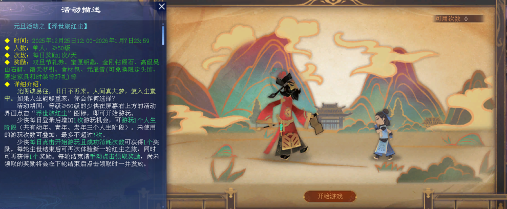 光阴诚易往,旧日不再来。近日咕咕向倩强烈推荐浮世旅红尘玩法,直呼倩女版模拟人生,既然咕咕玩,那么倩也玩!玩着玩着,忽而恍惚入梦,在梦中走过一遭红尘...... 你出生了,出生在一个平平无奇但温馨有爱的家庭之中。但你注定是不平凡的!从小你便展现出龙傲天的潜质,读书天赋非凡,过目不忘只是最基本的,夫子断言:“此子前途无量”! 读书、玩耍、被抢糖葫芦(好像混了什么奇怪的东西)......十岁那年,你遭遇了人生的第一次险境:为了一睹马戏团的神奇动物,你与伙伴小六结伴离家出走前往,指北为南的方向感令你们迷路误入山林,差点葬身狼腹。 经历过一遭“竹笋炒肉”后,你开始懂得生命可贵这个道理,若是消失在这个世间,谁又能比你的父母更难过呢?于是,后来的你主动停止了下河摸鱼这项危险娱乐活动。 其实你也差点成为“拆迁户”,曾有富商认为你家祖宅与他有缘,欲重金购之。当父母与你商议时,你想起曾在这留下的无数美好回忆,直呼不卖不卖。不知多年之后,你是否会后悔这一瞬间的决定呢? 时光匆匆,你渐渐长大,春日上山捕获野鸡,夏日你的玩伴小六决定离家闯荡,秋日吃着娘亲煮的桂花酒酿,冬日在窗边围炉赏雪...... 终于,你到了议亲的年纪,你思索良久,选择那位真心倾慕你的议亲对象。你想着,柴米油盐酱醋,或许爱更能抚平生活中的种种不如意。 十八岁这年,娘亲染病,家中情况大不如前,父母想到儿时夫子的夸赞,决定砸锅卖铁供你赶考。父母爱子,为之深远,你决定必要考个大官,为娘寻来名医! 悬梁刺股,凿壁偷光,皇天不负有心人!你中了!成为进士的你极得首辅大人赏识,从此在官场一路亨通。 你的子女渐次成长,从牙牙学语至成家立业,期间你的娘亲去世,你再也吃不到少年时那碗桂花酒酿了。后来,你应允了二儿子的分家请求,毕竟树大分叉,情有可原。 年岁渐长,你的身体大不如前,终于到了致仕这一天,你归乡养老,每日赏花作诗,携友同游,享受清闲退休生活。 六十八岁这年,你在祖宅小院的东南角偶然发现一罐黄金,儿时坚持不卖祖宅的你,在暮年时得到了先人的馈赠。 人生倏忽而过,在生命的尽头,你回溯往昔岁月,可曾后悔某些选择?你的答案是—— 人间真大梦,复入尘寰中。倩惊醒,回想刚刚竟在梦中度过了一生,果真是浮生一大梦,少侠们又体验了怎样不同的人生呢?体验结束后,记得领取红尘回首·礼匣哦~ 温馨提示:红尘回首·礼匣共可触发四次,需要在每轮人生结束后点击领取,忘记领取的红尘回首·礼匣将会在下一轮结束后点击领取时同时发放噢! 同时,倩倩·小贴士提醒您,包含浮世旅红尘在内的双旦活动将于2026年1月7日23:59结束,参与节日系列玩法,有机会获得双旦节礼券。提交礼券可以获得虾仁滑蛋、圣诞雪橇、雪米团子(新)、高级吴山石、宝匣钥匙等珍贵奖励! 道具·元辰雪可在对应兑换商店兑换奖励,少侠们记得在活动结束前及时兑换呀! 双旦活动虽临近尾声,但三界的节日氛围却依旧浓厚,恰逢雪景地图上线,这一年一度的新岁,少侠与朋友们是如何度过的呢?一起来看看吧~ (图源:微博@揽月为裳) 街市上红灯笼沿檐垂落,暖光漫洒,周边屋檐廊柱在光影里流转,正是一派元日热闹景象。少侠与好友们眉眼带笑,穿着冬日暖衣,似在私语什么趣事,结拜结拜!下次我也想这样出片! (图源:微博@揽月为裳) 新旧交替之际,街上人来人往,可恶!怎么到处都是小情侣,那就拉上侠侣一同逛!搭上情侣装,顺便磕一磕刀魅cp,谈话声、笑声、马蹄声在雪幕里荡开。 [编辑:月光下完美]