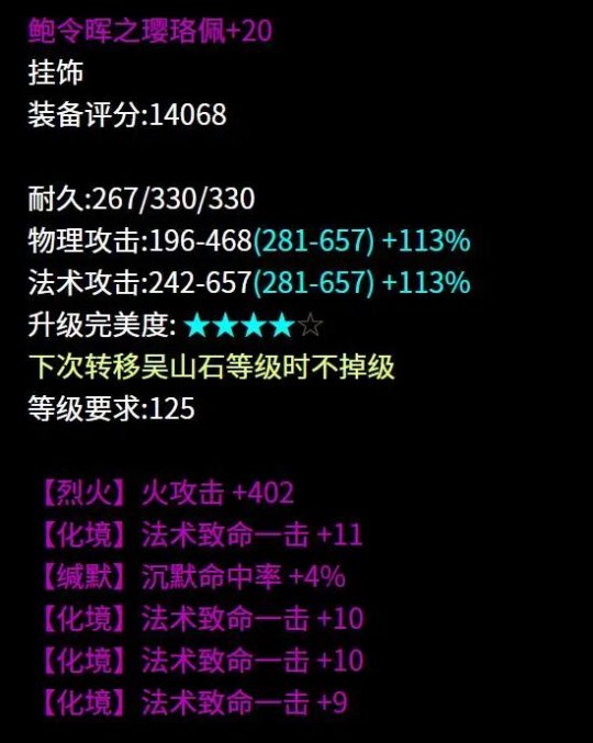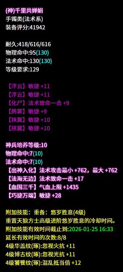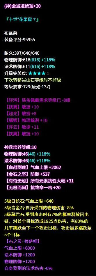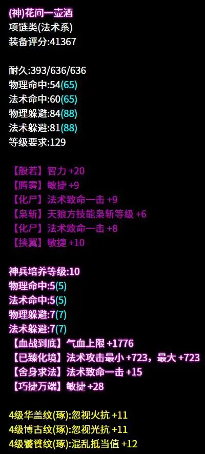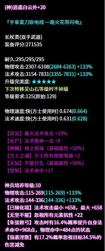 天尊真武坛·冬季赛正式拉开战幕 本届赛事依旧是大神辈出 来来往往全是能秒倩的少侠 今日随机向一位狼方少侠 想询问他的心仪战队 一看他全身的装备 好了,不用问了 少侠自己一个人就可以撑起一支战队 昵称:°九命猫ギ 职业:天狼方士 等级:129级 区服:[灵岛仙踪] 帮会:ぃ醉畫山河ミ (以下数据来源于更新于梦岛2026.1.8) 六绝双50+满最大+方士之魂 +法术命中+法术致命 凌晨四点,倩的邻居却一直在哭 礼貌敲门询问原因 原来是在关宁被大大揍了一顿 难受到晚上根本睡不着 六绝轻鸿+四敏+物躲的137布盔 冷知识:其实只看固定词条 我也完全无法赢过大大 乾坤袋你不必如此谨慎 七绝轻鸿+不修+双敏+双法躲 +混抗的137布甲 强者标配五级善根生加强防御 队友你们继续研究这个布甲吧 倩要去研究重力加速度了 六绝双敏+双法术致命 +智力+枭斩6的项链 犹记得跨年那天 不小心接了大大一招 晕过去醒来后 怎么莫名其妙就1月9号了 谁把我的时间还给我! 六绝轻鸿+四敏+法术命中的137手套 如果总有一个人能得到这个手套 那么这个人为什么不能是我呢 抱歉少侠,手套太耀眼了 暂时忽视了你的存在 你还要吗,不要给倩(试图做梦) 七绝神赐+四物躲的腰带 基础属性加强50%后 敌人面对少侠更加心如止水 不用再思考怎么打败少侠了 因为根本打不动 七绝轻鸿+五敏+法躲的137鞋 敏捷加强躲避与命中 侠许愿幸福 于是这双鞋子来到了侠的身边 六绝五敏+气血 对于少侠的乾坤袋来说 洗出高敏装备就是它的舒适区 求同款装备 如果没有的话,同款乾坤袋也行 六绝五敏+法术致命的戒指 冤有头债有主 如果少侠一定要找一个人针对 请针对我的队友吧 倩实在无法承受你的攻击 七绝轻鸿+五敏+混抗的137手镯 神说,诞生一个完美的装备吧 乾坤袋收到了这个信号 没有浪费任何一个词条位置 于是就有了我们看到的这个手镯 六绝五敏+法术致命 参观卢浮宫已经不觉得震撼 因为三界有更震撼的事物存在 比如这个高敏戒指 六绝四法术致命的挂饰 一代人有一代人的痛苦 我的痛苦就是 想在战场练习一下对战技巧 结果发现大大在对面 七绝四物躲+双法躲+晕抗 物理系别哭,你看法系也挺惨的 法系别哭,你看物理系也挺惨的 如果想获取幸福生活秘诀 那么就去成为大大的队友吧 这位129级的狼方少侠走的是暴力高敏流。武器方面双50满最大技能2的双手核武,打上五级大势至,输出非常可观。全身高敏带致命,配合枭斩6项链,几招下去,对手躺倒一片。 防具上整体高敏套,加强躲避,同时兼顾物躲与法躲词条,多件轻鸿137防具加强基础防御,不修衣服与神赐腰带更是非常亮眼,全身几乎没有废属性,生存空间拉满,更方便少侠打出成吨伤害。 [编辑:月光下完美]