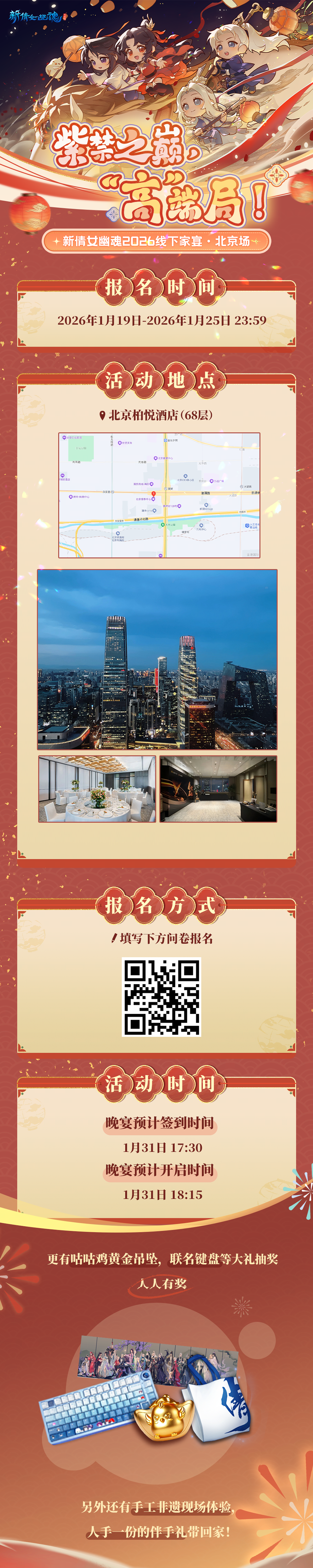 前夜团圆明月好,清光流照华筵。倩倩昨夜望月,回想上次与少侠们线下相聚,还是九月份的珠江奇妙夜,当时的温馨欢乐仍历历在目。 而今又是一年冬雪落尽时,腊月已至,怎能少得了一年一度的家宴活动。恰逢一念神魔版本天宫迭代,游戏内的天宫瑶池盛宴也将在不久后开启,我们特为此次线下家宴寻了个可赏高空美景之处,线上线下少侠皆可于琼楼玉宇处赴宴——新倩女幽魂2026线下家宴·北京场正式开启招募! (图源:微博@揽月为裳) 豪华晚宴·免费大餐 1月31日开启豪华晚宴,于数百米高空俯瞰北京冬日美景,不仅可享受免费美食大餐,还可亲手制作非遗手作。 入场即得·人手一份 家宴专属伴手礼静候每位参宴少侠,内含游戏周边与实用好物,赴约即满载而归。 家宴抽奖·人人有奖 家宴设置现场抽奖环节,咕咕鸡黄金吊坠、限定联名键盘等各类周边好礼,只要少侠参与抽奖,便绝不落空,必有所获。 温馨提示:请少侠在填写报名问卷时留下有效信息,报名结束后,若少侠成功入选家宴名单,将会有相关工作人员致电联系确认。 当然,其他城市的少侠也无需失落,2026年我们还会有更多线下活动等待大家,倩倩后续也将会在各个不同城市与少侠们线下相遇~ 腊月已经来临,家宴将要开启,那么大年三十还会远吗?不如提前来感受一下游戏内红红火火的氛围,在这点上,全新雪色漫芳华系列时装表示很有发言权! (图源:微博@缇缇宁兮) 当少侠使用雪色漫芳华系列动作·携月庭芳时,红伞环绕周身旋转飞舞,伞面上的红梅冷冽美丽,赤色拖尾流光于天际划过,角色更显英姿飒爽。 (图源:微博@缇缇宁兮) 雪粒如碎玉般簌簌而落,时装斗篷绒边似霜雪堆叠,冬日、雪景、梅树、斗篷...好熟悉的场景!不得不说,少侠的拍照功力好生了得! [编辑:月光下完美]