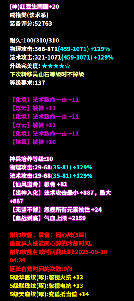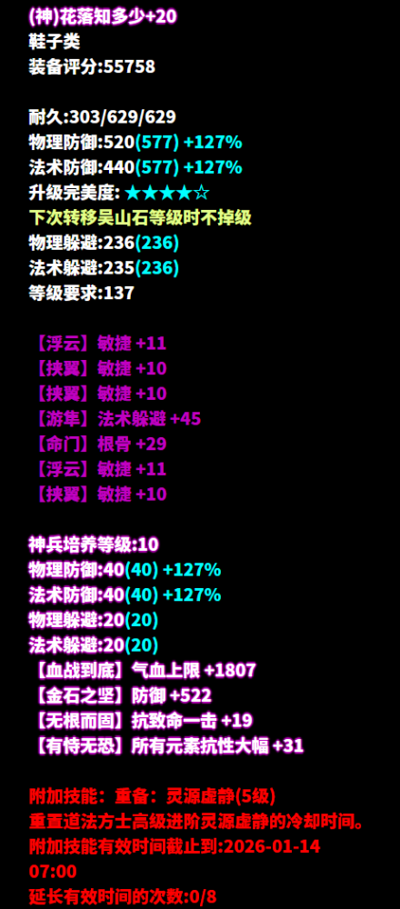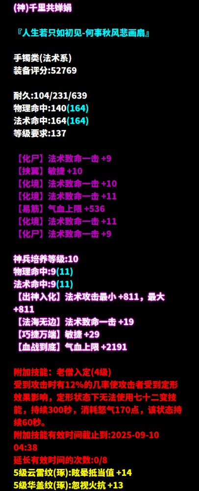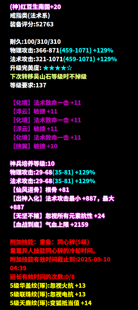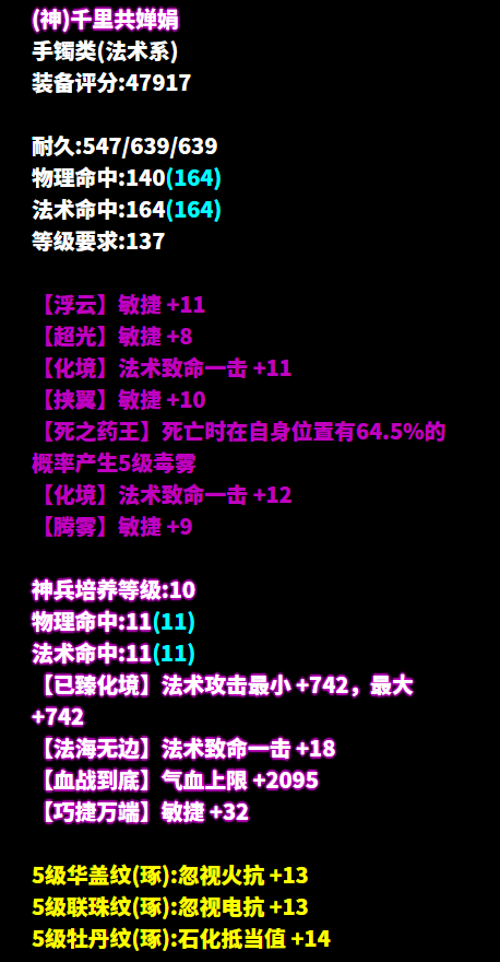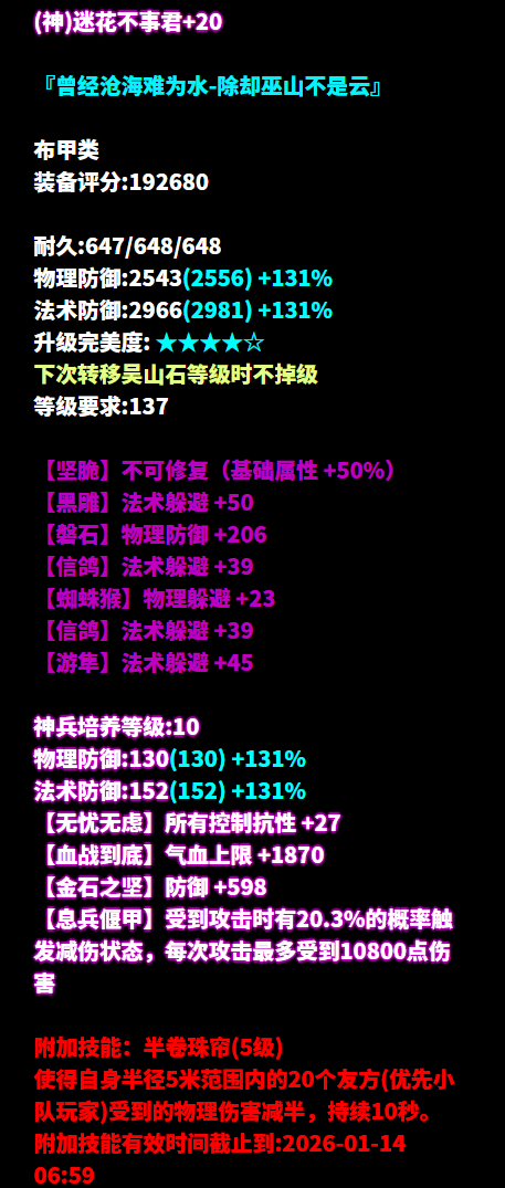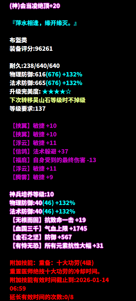 冻云垂地北风颠,妆点江湖欲雪天 今日大寒,砚冰坚 本倩手指不可屈伸 却不是被冷的 而是因为遇到了这样一位 实力一骑绝尘、又美又飒的老方少侠 在她面前,倩倩的手只敢放在玉石上 昵称:CC大魔王. 职业:道法方士 等级:150级 区服:[落霞云归] 帮会:迷雾の城 (以下数据来源于更新于梦岛2026.1.20) 七绝双神赐+最大+偃师职伤 +忽视所有元素抗+法术攻击 列位少侠,如果你们还容许 CC大魔王.少侠在这里见人就秒 那就容倩倩为保护血条先脚底抹油了! 七绝五敏+法躲 别再说倩倩天天立忧郁人设了 遇到这种命中拉满的少侠 倩倩的忧郁根本也不是装的 七绝不修+四法躲+物躲+物防 队友你醒啦 你刚刚好像做噩梦了诶 一直说什么CC大魔王.别打我 但我们已经在轮转司了呀 我们快趁着少侠没注意逃跑吧??? 敏捷+法术致命 +地火诀5+天雷诀6+气血 队友你们能陪倩倩一起去找少侠不 我们一起去找少侠求饶 我们这么多人他肯定会放过倩倩的 逆天五敏+晕抗+气血 少侠,倘若你只是倩倩生命中的过客 那你不应向倩倩索求太多 换句话说,如果你想收下倩倩的血条 首先要答应倩倩以后成为队友的邀请 逆天五物躲+法躲 +抗物理致命+抗法术致命 五级腰带石之灵具三明增强双防 小脆皮遇到少侠你们先别跪地求饶 万一少侠爱你不跪的模样呢 七绝五敏+法躲+气血 队友,倩倩欣赏你有独当一面的勇气 但世界有太多定律我们无法改变 比如遇到少侠 我们打不到她是正常的 我们还是快逃吧 六绝三法术致命+三敏 如果倩的戒指 和少侠的戒指一样 倩将想不出倩的泪水要从哪里流出 六绝四法术致命+双敏 少侠,既然你不想和倩做队友 那你靠近倩做什么 你别说是倩倩自己贴上你的 你没有推开倩不就是也想和倩倩做队友吗 七绝四敏+双法术致命 不管倩在忙什么、练得多强 倩都会被少侠秒杀 这大概就是倩专一稳定的好品质 七绝五法术致命+敏捷+气血 后天的努力真的很重要 所以今年和明年休息 因为就算到后年倩倩也打不过少侠 七绝四法术致命 别去穿越鳌太线了 穿越少侠一个人创造出的火线 看起来好像更有挑战性一些 逆天四物躲+双法躲+物防 世界上最危险的几大物种第一种:咸水鳄 二:眼镜蛇 三:装备强劲的这位三界少侠 这位150级的老方大大走的是正装双躲流,在武器方面双神赐最大的克偃核武搭配天雷地火项链把技能等级一起拔高,首饰全套堆高敏高命中,同时老方需要有一定的致命不能纯敏,这样才能打出超高单点伤害。 防具方面不修布甲保证双防,整套防具本身高敏捷打底物躲法躲同时堆,不仅群战游刃有余,和同门对拼也能抢占先机,输出更加灵活,可操作性更大,这样丝滑的老方谁能不爱呢~ [编辑:月光下完美]