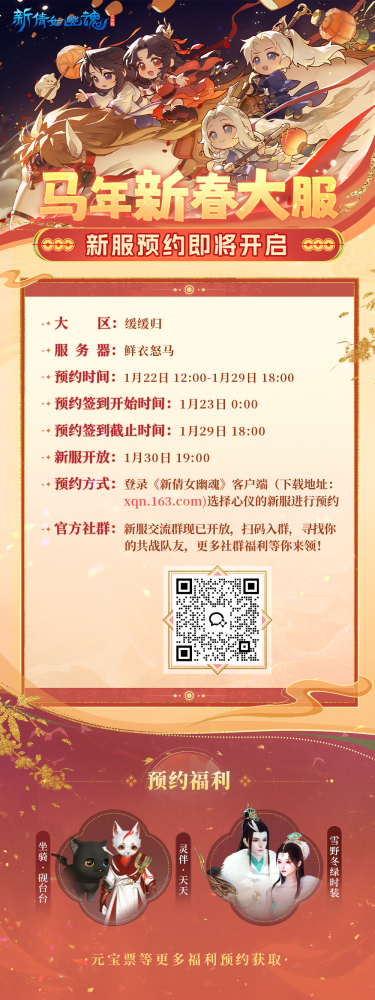 版本【3.0.520更新】今天已经上线 服务器的维护时间预计为2.5小时 一起看看本周更新了些什么~ 春节新大区首服开启预约 《新倩女幽魂》春节新大区首服“鲜衣怒马”服务器将在1月22日12:00开启新服预约(新服预约签到时间为1月23日0:00-