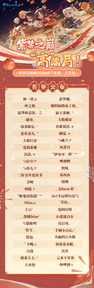 三界故事仍在续写,而马年新春服务器[鲜衣怒马]也将在今日19:00正式开服!马年春节盛典活动同步火热开启,无论是旧友重逢或是新朋初遇,都欢迎大家来新服[鲜衣怒马]一同畅玩三界! 马年来临之际,愿少侠无论在虚拟世界或是现实中,都能如骏马腾空,一骑绝尘!鲜衣怒马正当时,倩女邀您策马同游,赢取开年鸿运,共赴锦绣前程! 巧裁幡胜试新罗,画彩描金作闹蛾。离春节还有半月时间,本倩却已换上了新衣。不过少侠们可别打趣本倩还和小孩子一般心性,早早地就开始盼望春节,其实本倩精心打扮的原因是——要去和少侠们一起享今年的团圆家宴啦,期待期待! 冬雪辞旧,腊月迎欢,2026年的这份跨越线上线下的琼楼欢聚之约,终于敲定赴宴之侠~北京场家宴最终赴宴名单新鲜出炉,快来看看谁能同倩倩一起共赴这场高空雅聚,同度家宴的快乐时光吧! [编辑:月光下完美]