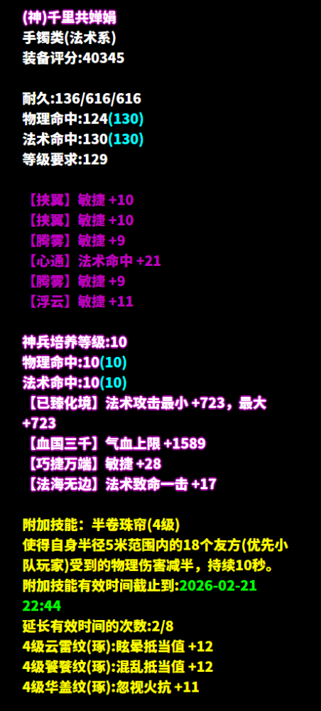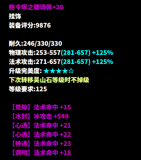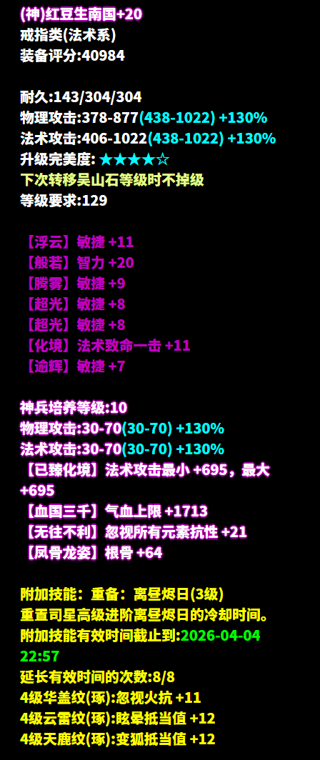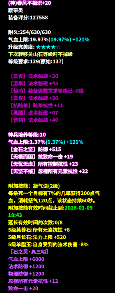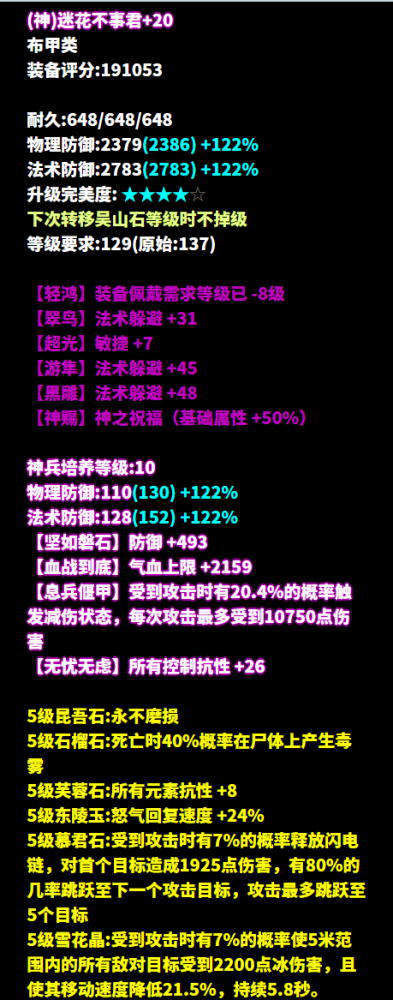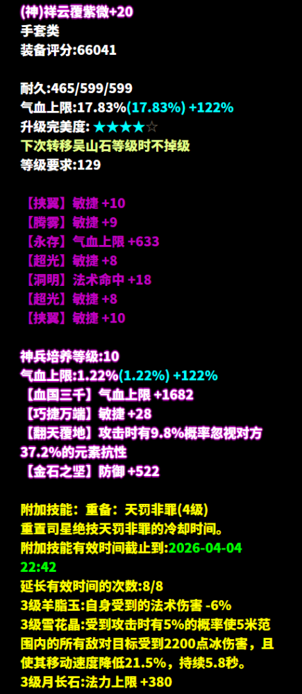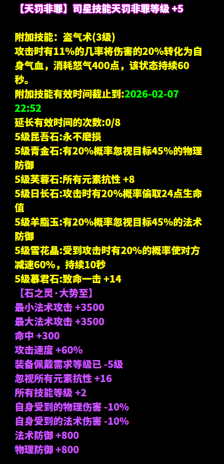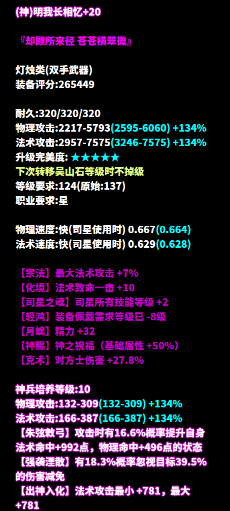 昵称:_昨夜又东风 职业:司星 等级:129级 区服:[落霞云归] 帮会:迷雾の城 (以下数据来源于更新于梦岛2026.2.4) 七绝轻鸿+神赐+最大+法术致命 +司星之魂+方士职伤+精力的137双手杖 五级大势至增强法术攻击 倩生不是旷