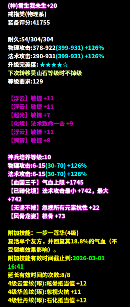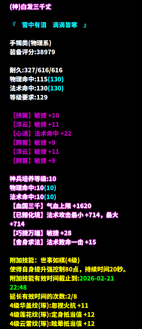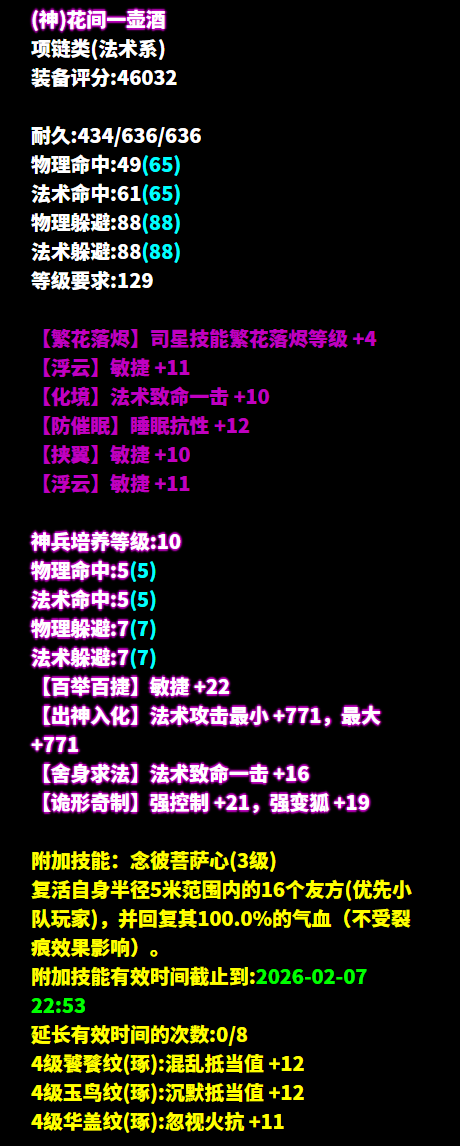 昵称:_昨夜又东风 职业:司星 等级:129级 区服:[落霞云归] 帮会:迷雾の城 (以下数据来源于更新于梦岛2026.2.4) 七绝轻鸿+神赐+最大+法术致命 +司星之魂+方士职伤+精力的137双手杖 五级大势至增强法术攻击 倩生不是旷野 是15岁还要被少侠 这个实力天花板之一所限 是15岁还要和小妖一起挤在幽冥界 七绝轻鸿+三敏+三法躲的布盔 感谢少侠促成一段姻缘!遇见少侠之后 倩和口袋里的玉石谈上了 倩把它抱得好紧好紧 六绝轻鸿+神赐+三法躲+敏捷的137衣服 倩也准备重返狼群了 每次遇到少侠 倩总是狼狈不堪鬼哭狼嚎什么的 倩想倩应该也是一头狼王 六绝三敏+法术致命+繁花落烬4 每次倩离开总是装作轻松的样子 实则已经巴山楚水凄凉地 少侠一招秒了me 七绝五敏+法术命中的手套 总说人无法估量某一个瞬间的价值 直到它成为回忆 但倩一遇到少侠,就知道这个瞬间 价值倩的一管血条 七绝轻鸿+五法躲+晕抗的137腰带 法系别觉得不可思议 我们少侠就是这么轻松赢的 觉得少侠随手就秒了自己的法系 回去认真想一想自己有没有努力堆命中 六绝轻鸿+四法躲+敏捷的137鞋子 怎么会不幸福呢 收到最爱的少侠送给倩倩的神鞋 每个词条都是倩想要的 倩真是忍不住发朋友圈炫耀了 少侠,你会送给倩倩的吧 六绝五敏+法术致命 为何绚烂叫人扑空 为何爱倩者予倩牢笼 少侠,你要是真的爱倩倩的话 别用这枚戒指把倩倩送去轮转司了行吗呜呜 七绝五敏+法术致命+智力的戒指 大概是倩太依赖少侠了 居然萌生了 想跟少侠永远纠缠在一起的想法 少侠可不可以一直和倩做队友 六绝五敏+法术命中 有侠问倩过年迎福气到底是在迎什么 哈哈少侠 当然是迎你这样的队友和手镯了 六绝五敏+法术命中 真不是拖延症 之所以等到最后一分钟再和少侠打 是因为那个时候倩年纪更大 做事也更成熟一些 拿着玉石的手也更稳一些 六绝五法术命中 本妖对于全身装备加起来 赢过少侠的挂饰这件事 已有十分的把握 但是少侠的手镯评分竟然是近一万 六绝五法躲的护心镜 少侠,说实话 你是不是三叶草丢失的第四片叶子 为什么你老能洗出 让倩倩求之不得的装备 这位129级的画魂少侠走的是高敏法躲流。武器方面直接上轻鸿神赐最大技能2还带方士职伤的双手灯,秒人轻轻松松。几乎没有废词条的首饰同时保留高命中和高敏捷,再搭上繁花4项链,高爆发力让对手无处可逃。 防具上轻鸿不修布甲拉高基础双防,其他防具高敏既撑起可观命中,更打造不俗法躲,为少侠应对瞬息万变的局势增添了更多灵活性。值得一提的是,大大的数件极品轻鸿装备本就底子极佳,洗后更是锦上添花,这般好装备实在让倩艳羡。 [编辑:月光下完美]