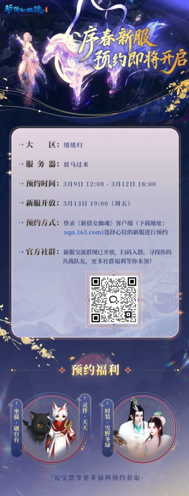 版本【3.0.524更新】今天已经上线 服务器的维护时间预计为2.5小时 一起看看本周更新了些什么~ 序春大服即将开启预约 《新倩女幽魂》序春大服[放马过来]将在3月9日12:00开启新服预约(新服预约截止至3月12日18:00,本次新服无预约签到