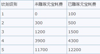好吧。。。上班无聊发下贴。。。由于本人文化程度小学毕业,算错了请看官及时指出~也让大家在弄纹刻之前了解下大概的花费 首先是合成单个各级玄铁刻的花费(每升1级需要两个玄铁刻合成1个) 接着是合成各个级别纹刻的元宝花费(3个相同纹饰合成1个高1级别的) 即是说,想要拥有一身三孔(即15个洞)的纹刻,在不计算玄铁刻和刻纹的获得成本的前提下(由于每个区消费水平不一样难以计算,以日后相当普及以后玄铁刻1万1个,石头1万1个做最低估计),各个级别消耗的总元宝数及材料数为 即是说打造一套5级的刻纹全身的成本大概需要2500RMB的样子,并不是很便宜的,而一些说要弄各种不同套件的大款。。。这个钱钱你们就自己算吧。。。
