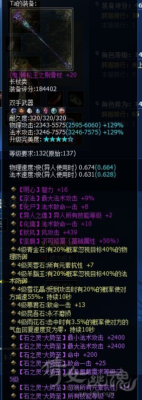 采薇南山 功夫熊猫 法攻37559 从图上各位可以看出,二人武器的主要区别为宗法和50%,武器均为7绝,强化条Q还稍微好一点,宗法为20%最高。 此二人的其他攻击类装备也类似,戒指强18,家园条Q太牛12级,功夫熊猫11级,修炼攻击也应相差无几,均为极限状态下 那么最终攻击数值,功夫熊猫略高,这还仅仅是最大攻击,最小攻击功夫熊猫应该远远超过条Q太牛,至少2000以上,这个会大大影响了综合输出能力 虽然我列出来的不是精确计算数据,但从侧面证明,在二人这么高的基础攻击下,宗法的实际攻击力都不如同档次下的50%,但很多玩家心中的误区就认为宗法要更好,其实这是完全错误的理解,表面上宗法是大幅提高了最大攻击,但并不增加最小攻击,相对来说并不如50%带来的实际效果。 如有错误,欢迎指正 一般来说,武器属性的原则(宗法一样的情况):粉<6属性<粉双宗法<7绝<逆天=6属性双宗法<50%<7绝双宗法<6属性50%<逆天双宗法<7绝50%<逆天50% 这个情况只是针对20-30万分左右输出玩家得出的结论,不是必然,仅供参考 [编辑:蓝月]