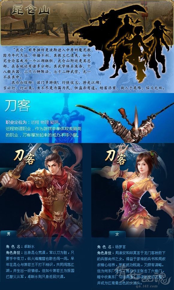 昆仑山-刀客 刀客与侠客并称昆仑二老,特点:频死爆发、物理近战输出、陷阱。 刀客是刺客型的角色。同时拥有爆发和控制技能。 刀客在PVE中表现不佳的同时和射手一样也是轮回司的常客之一。 PVP的优势表现在频死爆发和各种令人头疼的陷阱上,成长起来之后分身与陷阱是其能在PVP中成为单挑巨头的主要原因,十步杀一人,千里不留行。 当然相对于小规模战斗中耀眼的表现来说,大型战役中的表现却是差强人意,在各种法术与群伤中往往就是出师未捷身先死的状况。由于其PVP的劣势使其成长缓慢并且近战的硬伤导致死亡率也不低,如果没有过硬的走位技术及漠视死亡的心态,那么还是玩其他职业比较靠谱。 综合评价: 日常升级:★★★☆ 帮会联赛:★★★★ PVE需求:★★☆ PVP需求:★★★★★ 攻击能力:★★★★☆ 防御能力:★★★★☆ 辅助能力:★★★☆ 控制技能:★★★★★ 操作技巧:★★★★★