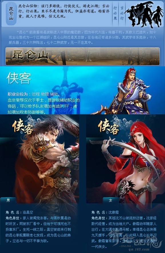 昆仑山-侠客 侠客与刀客并称昆仑二老,特点:光环、魔武近战、生存。 侠客虽然听起来很威风,但实际上是辅助型的角色。 侠客拥有各种光环技能的同时也擅长物理和法术两种攻击。在游戏前期的PVE及PVP中都处于弱势,都但是随着等级的提升及游戏的发展其地位也是水涨船高。 拥有短时间无敌及自疗技能的侠客其生存能力是当之无愧的NO.1。对于习惯单打独斗的玩家来说这种什么都会的职业真是个不错的选择。 虽然在一般的小型PVP战斗中都是打酱油的角色,但在大型战役中的表现实在令人欢迎,在各种光环的照耀下集体的力量将成倍的增长。侠客是属于默默奉献的类型,事了拂衣去,深藏身与名。选择侠客的玩家要三思而后行。 综合评价: 日常升级:★★★★ 帮会联赛:★★★★★ PVE需求:★★★★ PVP需求:★★★☆ 攻击能力:★★★★☆ 防御能力:★★★★☆ 辅助能力:★★★★★ 控制技能:★★★☆ 操作技巧:★★★★☆