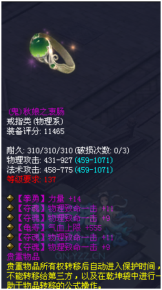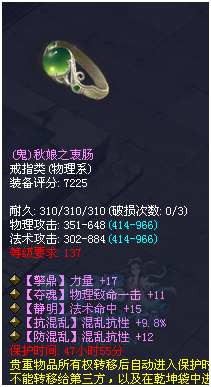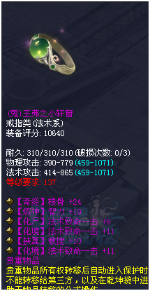 转一夫子庙的一名玩家(论坛ID:波风水门)爆料,自己45个瓶子就洗出来4件NB装备,感谢三十表哥的眷顾! 四致命戒指!一个戒指就有40点致命,让人羡慕至极。 混抗12点+混抗百分比9.8,还带一条法术命中。奶妈、魅者、侠客用都是极好的。 137级的7觉3格挡鬼护腕,还带晕抗百分比8.6和轻鸿-8,129就能带137的护腕,享受高基础,还可以打5级石之灵,属性也是极品到不行! 逆天3致命带1根骨1气血1晕抗8.6,又是件极品的致命抗性首饰。 随后,他又洗出两件装备,抽出固定晕抗百分比的戒指洗出了逆天双致命1力量2物理攻击!还有个6觉3法术致命1敏的戒指。 小编不禁感慨,真是好运来了挡都挡不住。 更多精彩内容,尽在叶子猪倩女幽魂。 [编辑:辰辰]