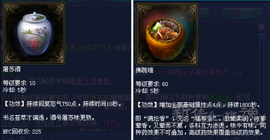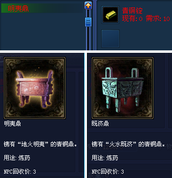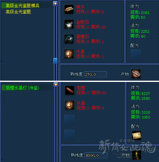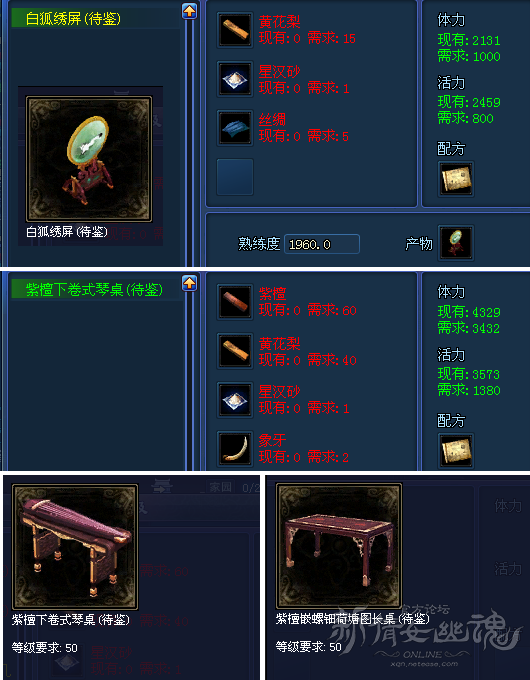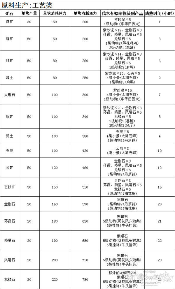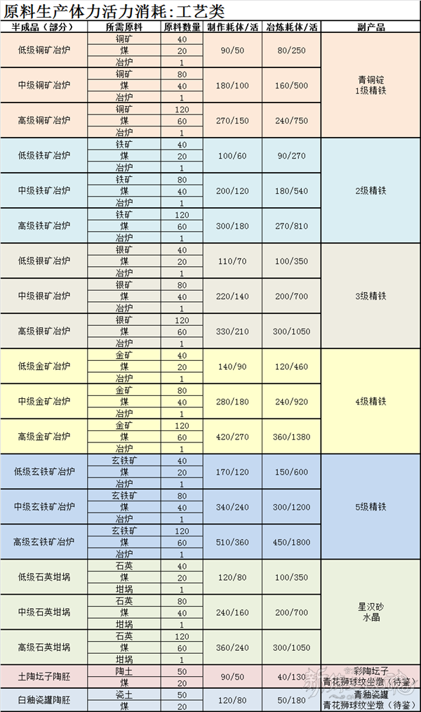 原料生产收获介绍 注: (1) 获取高等级矿石也可以通过采掘低等级矿石,收获副产品获得 例如:煤矿、铜矿、铁矿、银矿、陶土、大理石,收获紫砂泥的数量各不相同 铜矿石、铁矿石、银矿石,容易收到 金刚石,偶尔收到 落霞石、陨星石、凤睛石,极少收到 龙鳞石 金矿石、玄铁矿石,容易收到 金刚石、落霞石、陨星石、凤睛石、龙鳞石 (2) 动物指的是家具里的动物类家具,可以提升家园气数;挂饰指的是家具里的挂饰类家具,可以提升家园气数 部分半成品生产收获介绍 注: (1) 加工后的冶炉、坩埚的等级越高,收获副产品的概率越高 例如:高级铜矿冶炉收获青铜锭的概率比低级铜矿冶炉高 不过据个人测试,加工后,中级的坩埚、冶炉 概率也不低,而且材料消耗适中,只为刷副产品,可以用中级的 (2) 半成品冶炼成熟1小时后可偷,跟制作产品等级有关,跟采集原料技能等级无关 例如:中级银矿冶炉,炼药、烹饪、木作、工艺 大于等于 26级时,可偷取;种植、捕猎、伐木、采掘等级无关 (3) 半成品无论制作等级多高,只能同时生产一个( 即开启一个生产周期 ) (4) 这里只记录了大部分常用的产品,青花丹瓶、紫砂丹瓶等未做记录 稀有副产品用途部分介绍 这里介绍副产品比较实用的用途 青铜锭 用于工艺,制作 明夷鼎,副产品为 既济鼎、雷火鼎 用于炼药,是下面最高等级状态药的原料(雷火鼎几乎不用,所以不作讲解) 洞天膏——物理攻击+800 集灵膏——物理防御+480 熊脂膏——物理躲避+160 腊脂膏——物理命中+160 琼花膏——法术攻击+800 五枝膏——法术防御+480 紫茸膏——法术躲避+160 泥金膏——法术命中+160 彩陶坛子 主要用于 烹饪,制作 屠苏酒糟醅 还有 高级状态食物 佛跳墙 青釉瓷罐 主要用于 烹饪,制作 般若酒糟醅、十年状元红 还用于 工艺,制作4级挂饰家具 釉里红绿彩璧瓶(待鉴) 水晶 主要用于工艺,制作 高级含光鉴匣 (109装备鉴定用的) 还用于木作,制作杂物家具 紫檀水晶灯,造型美观,但是成本较高,堆气数不建议制作 还有 水晶丹瓶,合成130+小食盒的道具,由于成本贵,顺带提一下 星汉砂 主要用于工艺,制作唯一5级玩器家具 白狐绣屏 还用于木作,制作5级桌案类家具 紫檀下卷式琴桌,有副产品 紫檀嵌螺钿荷塘图长桌,不过成本较高,多用于装饰 了解更多相关信息,请前往http://qn.yzz.cn/ [编辑:犀利摇]