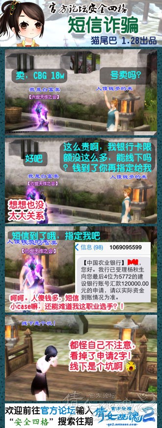 骗子很可恶!线下有风险。 损失总是自己的!问题发生之后再寻找GM,也不一定能保证毫无损失!近期出现不少被骗案例!请大家一定要谨慎!包括先把帐号给人家,然后被拆宝石等等…… 近期出现多个玩家被骗情况!特此强调,请千万不要线下交易!以上均为游戏真实案例! 他们会给你一条短信,或者一个银行转账的截图。稍微懂点的都知道,截图什么的。PS小菜一碟,分分钟能给你p个成千上万出来!千万要警惕! 以下是被骗的一些玩家提供的图片! 防骗TIPS 1、不要贪图小便宜,关于钱的都请认真对待:银行卡没有到钱,所有银行信息等请一律不要相信; 2、藏宝阁是官方唯一认可的交易平台,为了最大限度保护买卖双方的利益,请通过藏宝阁进行完整的交易; 3、请不要把自己的帐号告诉别人!就算是要买你号的玩家!因为你的帐号一旦给别人,号上的东西极大可能被盗!宝石等可能被拆交易掉! 4、避免进行线下交易,且此类交易不受官方保护,官方无法保证受理和追回相应损失 更多倩女资讯,尽在叶子猪倩女幽魂。 [编辑:辰辰]