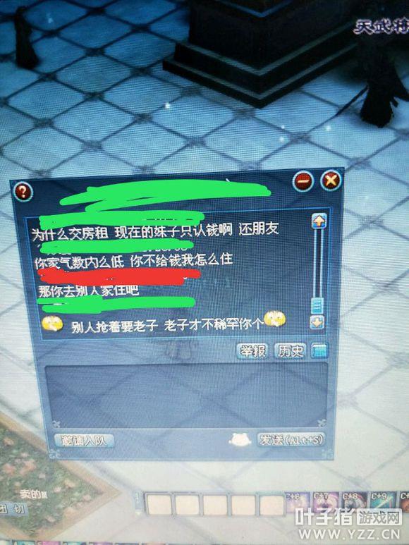 楼主是个09的美偃和倩女幽魂中的相公是现实,所以肯定平时相公一起玩的。由于楼主蹭相公家园,就把自己的家园给小号了,小号也有5000多气数,就种菜收菜攒个资材吧,蓝后家族的妹子和我说他有个基友要转服过来,能不能蹭一下我的房子,我想反正我也不玩小号,蹭就蹭吧。结果却遇上了一个大奇葩。 下面上聊天记录,我是爱国者,那个奇葩是原谅色。 好吧,这一波我是大写的服气,我就要蹭你房子还要嫌弃你家气数低,还得问你要钱,服不服。 更多精彩内容,尽在叶子猪倩女幽魂。 [编辑:辰辰]