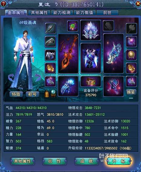在倩女幽魂里面看到一个属性面板,气血4W4,攻击2W5,物理防御1W2,法术防御1W3,一眼看过去,这个37W评分的129号属性有点一般呀,对不起这个评分呀。 忽然小编仔细一看,这这这居然是69等级的属性面板,感受到了来自土豪深深的暴击。 更多精彩内容,尽在叶子猪倩女幽魂。 [编辑:子衿]