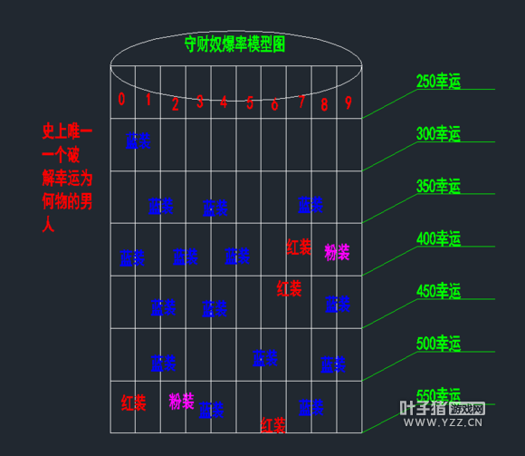 仔细看这张CAD,这是我做的倩女幽魂爆率分析图,当你幸运250时打开第一格爆率,爆一个蓝装,当你幸运400时打开第四格,会爆蓝,爆红,爆粉,为什么不会必爆粉装呢?因为上面有0-9,10个数字,当你的幸运尾数在粉装占的格子8和9的时候会爆,其他尾数都爆不出,当你550幸运的时候,开启第七格,这么你第七格会爆,第四格也会爆,但是你的幸运尾数要占四个数字,2、3、8、9,所以550幸运也不是必爆,当然有可能这个BOSS刷出来的时候,只站了一个幸运尾数比如0,你怎么打都不爆。一个BOSS刷出来的时候,有可能格子里没有粉装,你幸运数字不管是几。它都不会爆,有可能一个BOSS刷出来的时候有俩粉装,都在2和3位置,所以有时候会一下爆俩粉装,这样的解释最合理。 要爆粉装,首先要有足够高的幸运,这样能开启多个格子,第二个就是幸运尾数卡的运气够好,这样你会连着爆,还有就是这个BOSS刷新的时候需要很低的幸运就能爆,这就合理的解释了为何0幸运也会爆粉爆鬼,每个BOSS都有初始的幸运值,这是有公开的。幸运固定后,一个点打几天,挑一个最好的固定不动就行了。比如粉装在9号位置,你幸运尾数9,你觉得你打几次能打到9这个粉装位置呢?当然肯定会有提生方案,比如你打了20个BOOS,粉装原来占一格,现在成了3格,当你打到50个的时候,粉装变成9格,那你不就爆了吗?怎么能让你一直打都不爆,游戏不用开了。 更多精彩内容,尽在叶子猪倩女幽魂。 [编辑:子衿]