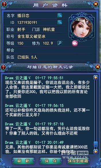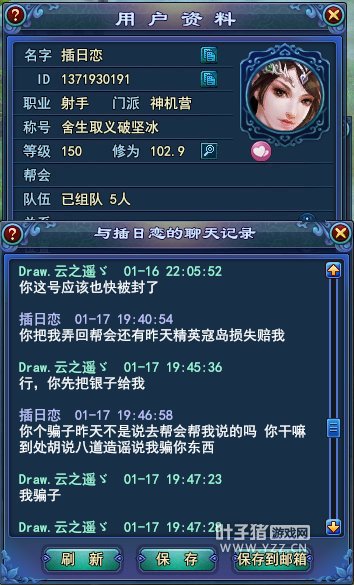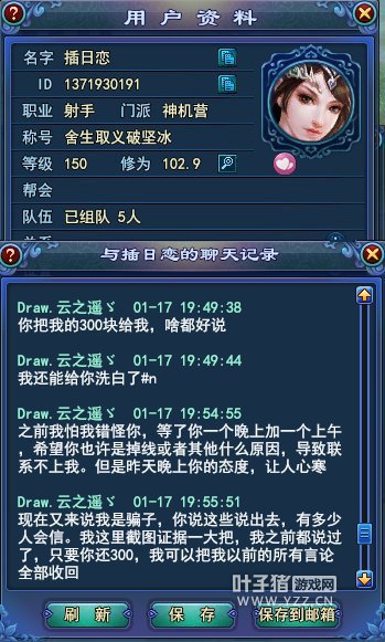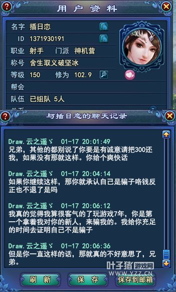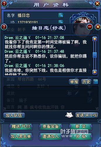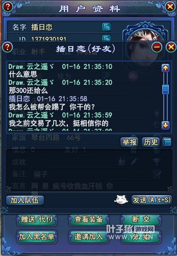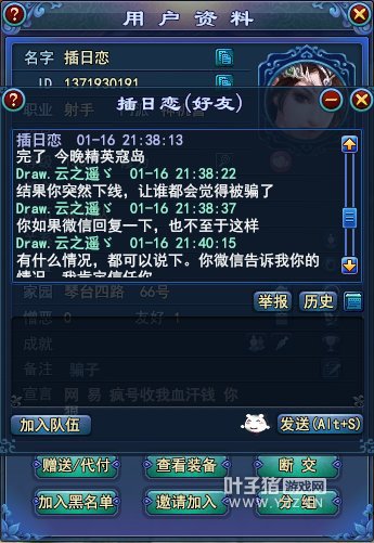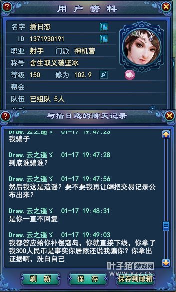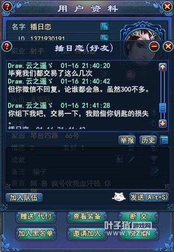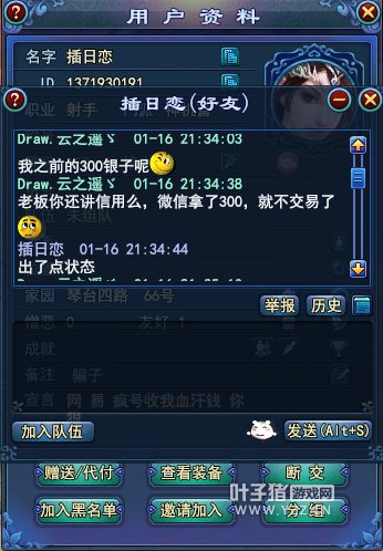 鉴于年底骗子猖狂,小Z将在近几期的推文里向大家展示几个骗子以及一些行骗过程,希望大家互相提醒,多留个心眼,保管好自己的虚拟财产。 这个骗子是西子湖的150女射手插日恋,帮会是【最强王者】,微信号为wxid_gek88y7iyiie22。 (图片出自:云之遥哥哥) 苦主之前在这个骗子手里买过次菜,虽然先给钱,但每次都是钱货两清,没出任何问题。慢慢的,苦主就相信骗子了。 这次苦主又找骗子买菜,骗子说有5颗,苦主全要。二人先交易了两颗,随后的三颗,骗子拿了钱就下线了,游戏不见人,微信也没回复。 苦主第一时间就找到了【最强王者】的管理,说明原委后管理就把骗子踢了。当天晚上的帮会活动正好是精英寇岛,骗子上线后,苦主马上追问过去,骗子却反问自己被踢的事,在苦主的追问下,又下线了。 (图片出自:云之遥哥哥) 第二天骗下午子上线找到苦主,理直气壮的要求赔偿被踢的损失。苦主要求把剩下300块的银子补上,骗子却先急了。 (图片出自:云之遥哥哥) 苦主一直在积极的解决问题,奈何骗子却没有任何表示。直到最后苦主还是没有拿到银子也没有收到退款。 各位小伙伴们,玩游戏一定要擦亮眼睛,骗子也许就藏在熟悉的人里,甚至还有可能披着师徒、固定队的羊皮伪装,之所以没有开始作为,是为了取得你们的信任。 更多精彩内容,尽在叶子猪倩女幽魂。 [编辑:夜雨未柳]