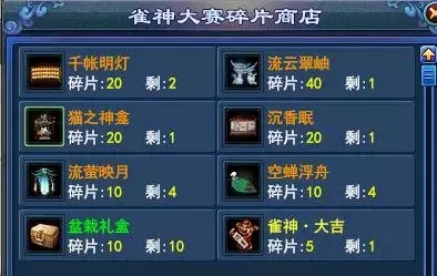 倩女首届雀神大赛在昨天更新后就开始了热身赛。热身赛从22号开始持续到25号,每晚22点开始到23:59结束。玩家报名并参与热身赛就可以获得雀神碎片,雀神碎片可用于兑换家具或者幸运buff。每种家具所需的碎片数量不同,剩余表示该角色能兑换该家具的数量。有不少小伙