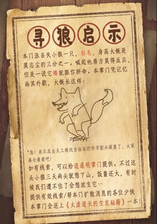 我,太虚道长 近日遇上一件棘手大事逍遥观从小养到大的小狼意外走失 因小狼具有一定的破坏性和杀伤力 若不及时找回可能会造成严重后果 所以本掌门于各大主城都张贴了如下告示: 小狼灵活好动,喜欢跳跃并且力量十足 落地的时候十分震撼 周围的敌人会像被罚站一样无法动弹 小狼对待进犯本门的妖邪很凶 但对同伴很亲近 它心地善良也很粘人 喜欢背着它的师兄师姐们到处跑 小狼虽好动,但也有安静乖巧的时候 它喜欢对着月亮发呆 但是如果你说它矮 它可能会扑击撕咬你! 请切记不要在它前面提及相关字眼! 最近有逍遥观的弟子反映说 自己会突然出现在另外的地方 我们都在猜想是不是调皮的小狼所为 因为小狼还在成长期 所以还有部分的潜能我们未能了解 如果有少侠在三界中发现了小狼的踪迹 或是根据以上描述/对小狼的观察 适当猜想小狼可能拥有的技能 都可以和本门派上报 少侠们可在留言区提供有效线索 或是帮本掌门将此告示卷发至各位的票圈 将分享票圈的截图发送至公众号后台 本掌门将从以上提供线索/扩散告示的少侠中 选出各五位少侠在11.29日前 送上精心准备的周边大礼一份 【妖灵城全家福鼠标垫*1+妲己团团*1】 听闻最近东厂秘密搜捕奇珍野味进献皇宫 他们不会想对我们的小狼下手吧?如果是真的话看我不和聂公公大战三百回合! 本掌门爱狼心切请大家看到它的话务必提供有效线索! [编辑:夜雨未柳]