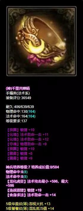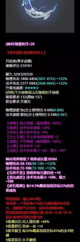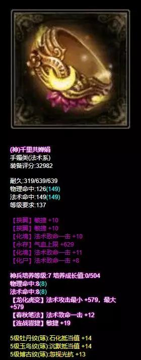 昵称:当你途径我的盛放 等级:150级 职业:天狼方士 服务器:[挑灯看剑] 帮会:修戈 (以下数据更新于梦岛2020.1.17) 如果要评比天狼方士核武器 这把单手月轮肯定榜上有名 七绝神赐+最大+不修 基础属性+100% 轻而易举就能给对手致命一击 打上石之灵五级悟则圣 杀伤力更上一层楼 要是倩倩正面对上大大 一定要先溜为敬 布甲 灵活的天狼自然既要高攻也要高防 大大的这件布甲七绝不修+神赐基础属性+100%,防御高人一等对手攻击多凶猛都不害怕! 倩倩如果能穿上这布甲是不是在赛场上都可以横着走? 布盔 看这整整齐齐的 四法躲+双敏捷的布盔 让倩倩感到非常整齐舒适 拥有这顶被躲避和敏捷承包的帽子 场上最灵敏的狼非你莫属! 护腕 大大的护腕真是十分贴心而全能! 在三格挡+双大幅的基础上 还有混抗+沉默抗,双抗的保护 不管是物理输出法术输出 还是魅者的控制 都可以做到毫不慌张 手套 大大的手套也十分全面固定无钻令基础属性+50%,气血提升 同时还拥有三敏捷+晕抗在保证气血的前提下 抗性和灵敏度也得到保障~ 腰带 神赐和大大一定有着极深的缘分 就连腰带也不容忽视 固定神赐,基础属性+50% 还有三法躲+混乱抗加持 气血我有,灵活管够 鞋子 大大的法躲和敏捷真是从头武装到脚和布盔简直孪生双胞胎 整整齐齐四法躲+双敏捷穿上这双鞋子一定能身轻如燕攻击躲避都快人一步 项链 戴上敏捷+致命+方士之神的项链 各种需求一并满足 遇到了先别跑啦 不如先来试试这个技能伤害够不够? 手镯 六敏捷+五致命的一对手镯将灵敏和输出贯彻到底 不怕失手,也不怕伤害爆发不够 用上这对手镯 每一击的枭斩都能快准狠地让对手倒地! 戒指 大大的装备每一处细节都不容小觑 五致命+四敏捷+法术命中的一对戒指不用担心失手了争取每一击都让对手尝尝致命滋味! 同时还具有晕抗百比+晕抗的加成 抗性也出色过人 这位天狼方的单手核武属性相当出色 保证输出的同时也能依靠护腕提高生存 全身的防具多敏捷和法躲词条 配合首饰上的敏捷把命中尽可能地堆高 毕竟对于天狼方来说 快速上齐印记不失手最为重要! [编辑:夜雨未柳]