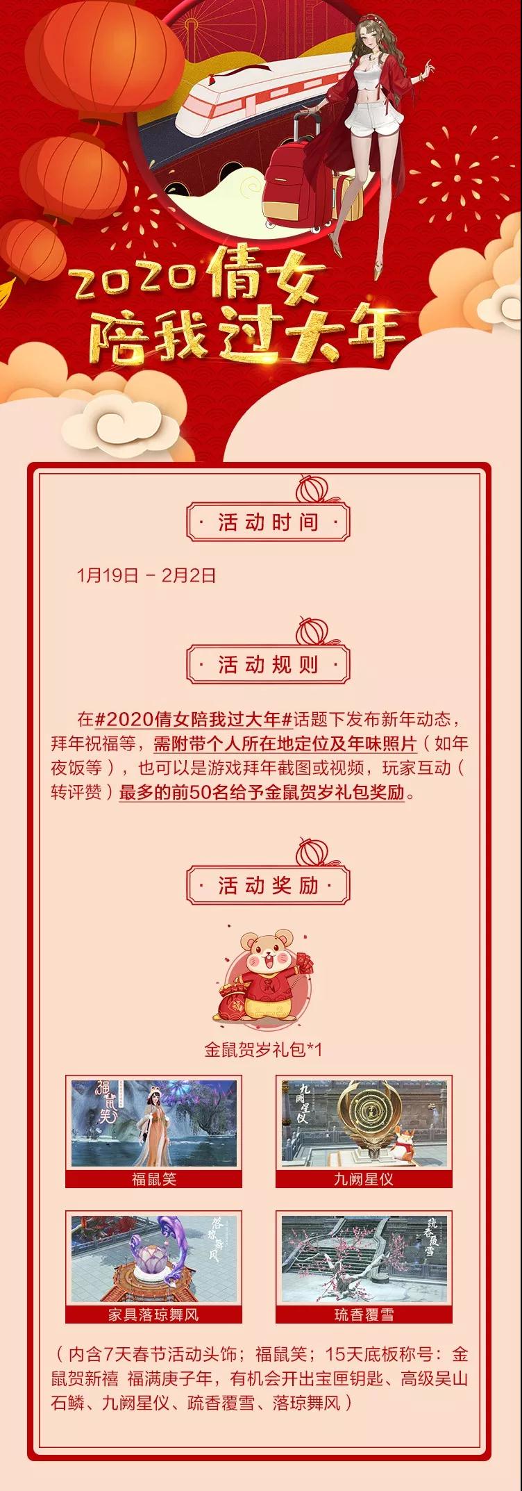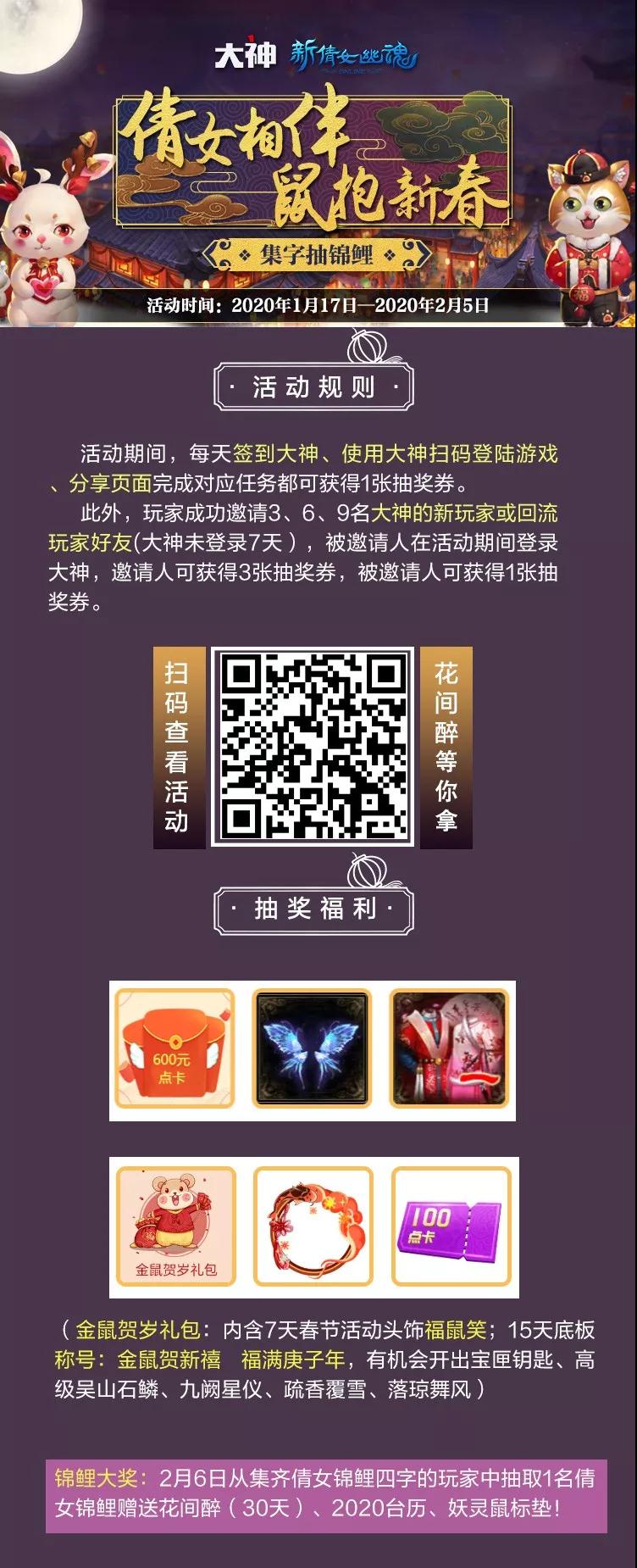 过年期间大神福利送不停 多重好礼参加活动即可获得 快和倩倩一起去划重点了解一下! 集字抽锦鲤 倩女陪我过大年 这么多的福利各位大大都get到了吗 一起参加活动一起打卡 和倩倩一起将奖励抱回家! [编辑:夜雨未柳]