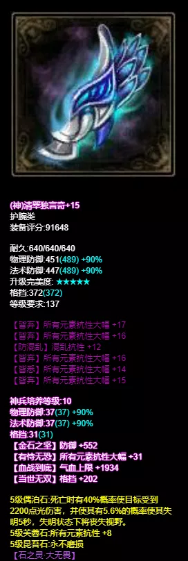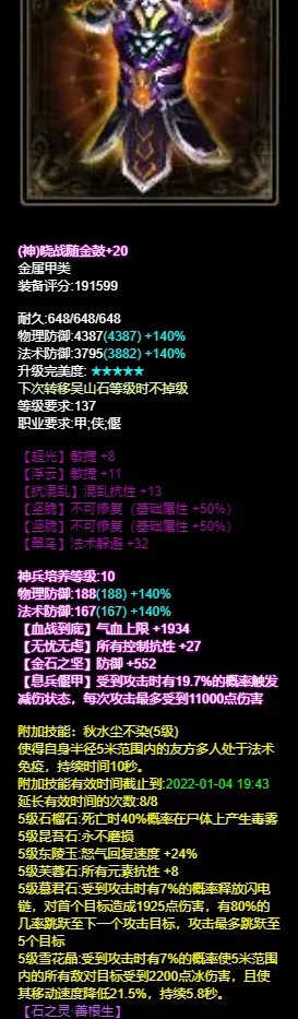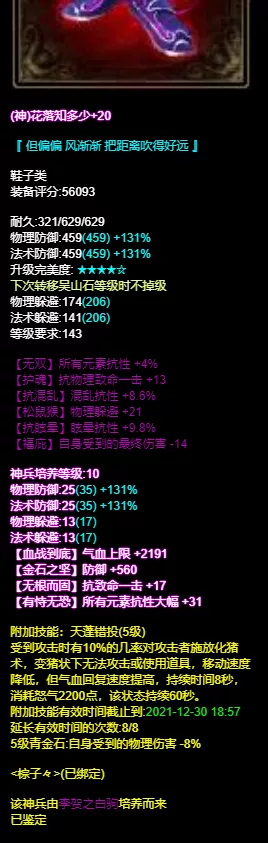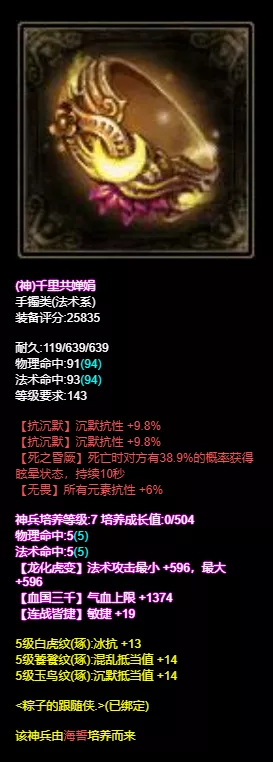 大家都知道,倩倩是战场躺平小能手 可是今天却碰到了一位侠妹 只见她手握各种buff和免疫保护 穿着一身抗性百比出现在我面前 倩倩瞬间充满了力量,在战场游刃有余 这位侠妹简直可以称得上最佳辅助! 我们一起来看看她的装备吧~ 昵称:棕子々 等级:150级 职业:侠客 服务器:[挑灯看剑] 帮会:星.辰 (以下数据更新于梦岛2021.11.18) 这把不药而愈+6和天涯比邻+6的刀剑 拉敌人,保护队友的同时 也能解除队友身上的负面状态 还有晕抗百比的加持,抗性提升 这件固定双敏+混抗+不修的金属甲 走位灵活的同时抗性提升 洗出六绝双不修,基础属性+100% 让大大在战场上站的更稳 鉴定技能:秋水尘不染 使附近友方处于法术免疫 有效减少队友受到法术伤害 这顶布盔的属性优秀 满数值的双抗百比+元素抗百比 既不怕被控,又能抵御元素攻击 这件固定三大幅+混抗的护腕 洗出六绝五大幅 令大大无惧元素攻击和控制 这副固定无钻+敏捷+混抗+气血的手套 洗出满数值的混抗百比 在战场上防止被控,灵活自如 鉴定技能:重备:五气朝元 重置侠客绝技五气朝元的冷却时间 连着两个免疫,就问你怕不怕! 这双固定元素抗百比+混抗百比的鞋子 洗出晕抗百比+9.8% 穿上这双鞋子走路生风,步步稳健 鉴定技能:天蓬错投 受到攻击时有概率使对手变猪 有机会可以限制一波敌方输出 这条固定无钻+混抗的腰带 基础属性+50%,血量充足 洗出一条晕抗百比+9.8% 全面防护,战场上更安心 鉴定技能:重备:三花聚顶 重置侠客绝技三花聚顶的冷却时间 一个法术免疫不够?那就来两个 不药而愈+6和天涯比邻+6的项链 重要技能等级提高 搭配武器使用效果更佳 兼顾混抗百比,再次提高抗性 将抗性贯彻到底的手镯 三沉默百比+混抗百比,且都是满数值 还有双元素抗百比的加持 各方面的抗性都十分优秀了 与手镯一样抗性数值超高的戒指 拥有双混抗百比+沉默抗百比+沉默抗 还有三元素抗百比助阵 让大大有效防控+辅助,全力保护队友 鉴定技能:金刚不坏身 使自身半径5米范围内队友处于物理免疫 金牌辅助非大大莫属了 这位150侠妹致力于提升自身抗性 首饰和防具均主堆抗性 三大控制抗和元素抗应有尽有 且抗性词条大部分都为满数值的百分比 全面提升自身抗性,避免被控 发挥更极致的辅助能力 武器和项链上的侠客双技能 让大大在团队中发挥更大的作用 在多条鉴定技能的保护下 也能提高自身生存空间 更好地保护队友,辅助能力超强 [编辑:嫆之]