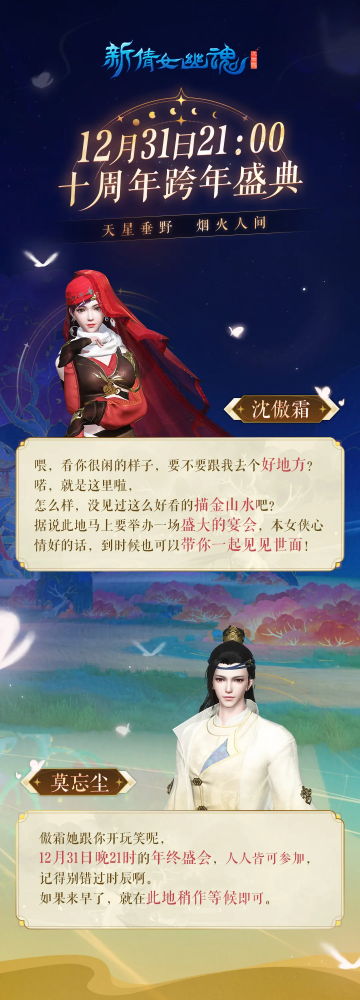 十周年跨年盛典正在火热筹备 此次盛典搭建了6个全新国风场景 各色各异、却都美轮美奂 后台蹲着的倩倩看得挪不开眼 即使只是彩排,现场也依旧热闹 相机的咔咔声就没停下来过 还未正式开始,大家已难抑激动 现在就来一起抢先围观其中3个场景吧! 倩倩一直向往着浪漫星空 看霍击蒙邀青桑共赏流星雨后 倩倩也按捺不住心动 独乐乐不如众乐乐,希望大伙都来呀~ (咦 喊完怎么觉得背后一凉 皎皎月光、浓浓花香、茫茫云海 一切都清新明快,传递着对自由的渴望 无垠的花海,璀璨得星空 让人想在这广袤天地间肆意奔跑 蒲公英飞舞,快乐洒满了山坡 从上一个场景走来 倩倩看到了截然不同的风景 一种全新的风格马上占据全部视线 傲霜此番相邀,倩倩当然愿欣然陪往 盛大宴会,搭配描金山水 到时候若人多可得跟紧傲霜才行 (咦 应下后怎么觉得背后又是一凉 日出江花红胜火,春来江水绿如蓝 以瑰丽色彩绘新霞花树、暮夜重山 灿金几笔勾勒出云卷云舒 是良辰美景入画,抑是纸上山水成真? 明月千年亘古,树木四季常青 新倩女等待着你共赴明年春朝 一路从浪漫星空走到彼岸花海 定睛一看,彼岸花好像变少了 倩倩不由好奇往前一探... 待到听见渐隐和叶葬花的约定 又看着两人结伴离去后 倩倩终于可以为剩下的彼岸花松口气 用灯箱与纸伞、屏扇搭建阁台 繁华阁台后白狐静静伫立 盏盏明灯带着思念缓缓飘向夜空 河上“燃”着与灯火交相辉映的烟花 岸上绽放着的片片殷红彼岸花海 天地间所有花都热烈地开着 人也该淋漓尽致地活着,不问归处 倩倩现已将期待值拉满 恨不得直接穿越到年终盛典 在国风仙境中感受凤凰传奇的天籁之音 大家看完是否跟倩倩一样期待呢? 逍遥百业·食神活动火热进行中 女医师殷紫萍下山行医济世 不仅如此,她还打破了次元壁 从二次元来到三次元 倩倩要看看是谁的DNA又动了? 开心的倩倩决定也给大家发福利 快去视频号点赞、评论、转发 然后截图,后台发给倩倩 倩倩会随机抽3份全家福鼠标垫送给大家~ 国民级嘉宾凤凰传奇重磅来袭 清鸣万籁之音,引爆倩女宇宙 天星垂野,烟火人间 和倩倩一起期待 十周年盛典新歌《望星辰》 [编辑:嫆之]