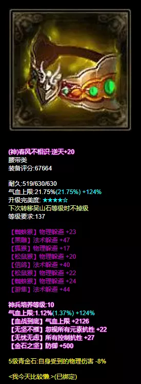 都说腰好人就好那么腰带的重要性不言而喻倩倩这就发现了不少让人眼馋的腰带现在来一起围观这些护身宝带吧整整齐齐七条法躲的逆天腰带面对法术系攻击射娘表示:旋转跳跃我闭着眼伤害看不见,你命中了没固定三法躲+混抗的腰带洗出逆天五法躲+双物躲放肆爱放肆追放肆去闯反