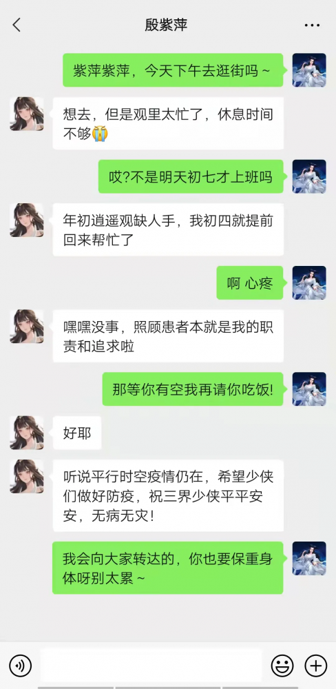 不知不觉就已经到了初七假期结束,少侠们陆续返校返工如今疫情仍不可松懈希望诸位少侠路上都要注意安全呀另外近来倩倩也跟一些门派有所联系在今天携手为大家送来祝福祝大家事业有成、学业顺利倩倩先是带着紫萍小姐姐的祝福来了虽然很忙,她也依旧牵挂着大家祝各位少侠一