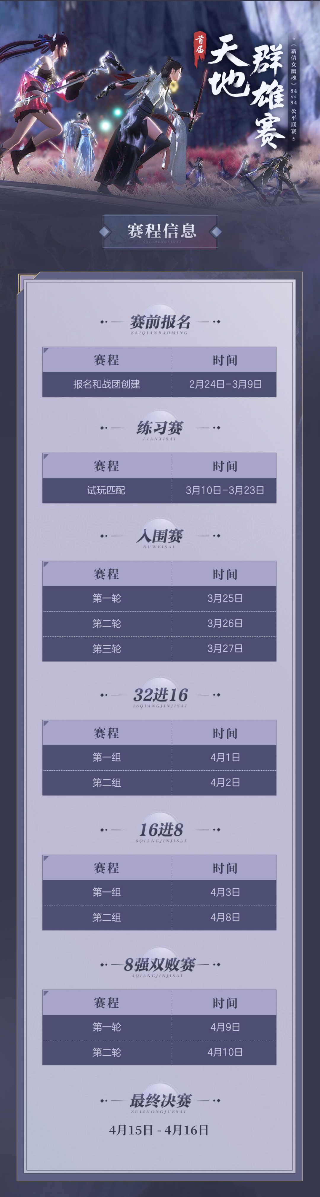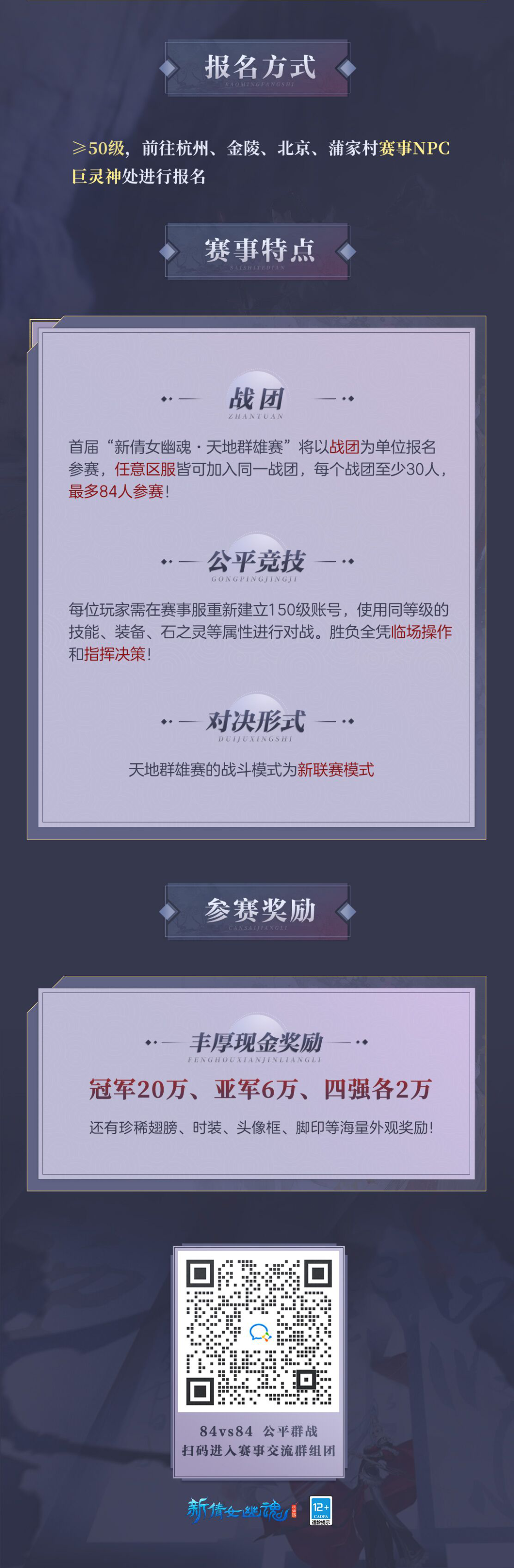 版本【3.0.332更新】今天已经上线 一起看看本周更新了些什么~ 新服预约开启 《新倩女幽魂》将在2022年3月7日12:00开启新服预约(新服预约截止至3月10日18:00,本次新服无预约签到),3月11日19:00正式开服!现在预约可立得:全新纪年礼包——内含灵伴小天天、砚台台坐骑等。初春活动开启,邀少侠一同体验农耕春忙,新年伊始,收获满满。 初春活动全服开启 “微雨万象新,一雷始春生。”——初春活动全服开启,各位少侠可前往各大主城参与活动。 1. 地喜昭融。春雷乍动之际,万象更新,春日的好礼也随之而来!3月3日12:00到3月16日23:59期间,≥50级少侠在线每满30分钟就可以获得一份春雷昭霁礼,每日最多获得6份。右键打开礼物盒,即可获得神秘惊喜! 2. 初春之【惊蛰花信】——惊蛰花信风,一候桃花、二候棣棠、三候蔷薇。曾有群贤聚于丝竹兰亭之间,共吟春日花信风。3月3日12:00-3月16日23:59期间,≥50级的少侠可至少三人组队,寻找碧遥再次前往曲水流觞,撷杏花成诗,吟锦绣佳句。 3. 初春之【春耕插秧】——溪水堪垂钓,江田耐插秧。稻畦插遍青如染,满望今年倍有收。3月3日12:00-3月16日23:59期间,≥50级的少侠可前往金陵、杭州、阿格拉、北京寻找周婆婆参加。 山海妖灵集拼图活动全服开启 “不要人夸好颜色,只留清气满乾坤。”——山海妖灵集拼图活动全服开启!3月3日12:00-3月16日23:59期间,≥50级少侠,点击主界面的山海妖灵集小图标即可参与,每日通关奖励、排行榜奖励等你来拿! 图片 图片 2022首届天地群雄赛报名火热进行中 “群雄并立,天地之间,公平公正,请君来战!”2022年度首届天地群雄赛报名火热进行中,该赛事以战团为单位报名参赛,凡是50级及以上任意区服的玩家皆可在2月24日12:00-3月9日23:59期间寻找各主城或蒲家村的巨灵神进行报名,体验满级50万装评账号,瓜分三十万现金奖励和大量游戏珍稀奖励。本周规则公布如下: 1. “智勇双全坐帐中,算无遗策是卧龙。”孔明军师评选活动报名开启,可前往巨灵神处了解详情。 ① 报名时间及限制:3月3日10:00-3月23日23:59,需处于战团内,若所在战团解散、退出战团或取消天地群雄赛报名,孔明军师评选报名资格也会失效,即失去孔明军师评选活动的参赛资格。 ② 评选(投票)时间:2022年3月24日10:00-4月10日23:59。 ③ 评选方式:将由赛时军师积分、参赛英豪积分、三界少侠积分三者综合进行排名。 ④ 评选奖励: [1] 孔明军师:最终排名第一名获得“孔明军师”殊荣,将获得税前10000元现金奖励,还将额外获得90天全新时装—绯愿天明、90天坐骑-云龙天马礼盒、90天特效精美称号“谋人亦谋天”和天意启灵册; [2] 参赛英豪:拥有群雄赛参赛资格的英豪在每个阶段可对支持的军师进行投票,每个阶段只有1次机会,所支持的军师对应其战团不论成功/失败都可获得对应的胜/负奖励; [3] 三界少侠:所有少侠可通过每日投票或累计投票获得不同的惊喜奖励。 2. 替补席位: ① 当战团出战名单已满时开放替补席位,替补席位至多6名。 ② 团长或战师可在参赛名单中设置“上战名单“和”替补席位“,只有”出战名单“中的玩家才能进入战场,替补席成员无法进入战场。 ③ 天地群雄赛的名次奖励包含替补席位,但每场战斗奖励只有参战的成员可获得,轮空则全员获得。 3. 转服规则: ① 截止3月9日23:59已报名天地群雄赛的玩家需要取消报名即退出战团才能转服。 ② 报名截止后,转服无限制,转服后新的本服角色将会自动与赛事服角色进行同步和关联。简单来说,报名截止后即使转服了也可以用新的本服角色领取赛事服参赛奖励。 4. 多开限制:赛事服限制每台电脑同时至多允许2个角色登录在赛事服。 5. 赛事服装备配置:基于全民争霸赛角色配置调整到50w装评。 ① 装备路线:法躲、物躲、敏捷、抗性选取无变化。 ② 武器石之灵调整为3级悟则圣/自在天/大势至/无妄想,衣服石之灵调整为3级善根生。 ③ 除藏刃刀、断恨刀,金刚甲、战魂甲以外增加了领取职业正装的限制,同职业只能领取同职业的正装。 ④ 道法方双手武器“(鬼)五灵老君之敷明杖”的第五条词条最大法术攻击调整为不能打孔。 ⑤ 增加了修身配置,至多可设10项修身,每项10级。 ⑥ 增加了满级中级进阶。 6. 赛事服基础配置: ① 将会发放改名金匾,可更改一次角色昵称。 ② 允许随时变性。 7. 雪域之巅联赛调整: ① 增设罡风,每场战斗将会随机一条边路出现罡风,可通过罡风传送至另一条路,传送时若受到多次攻击或处于控制状态则会取消传送。 ② 麒麟调整:击败不同麒麟可获得不同的增益效果。 麒麟·迅猛:击败后,全员获得移速。 麒麟·坚攻:击败后,全员获得攻击和防御加成。 麒麟·气锐:击败后,全员获得气血上限提升。 ③ 将军威和玄霄怒增加自动恢复气血上限。 ④ 提高了摧毁天机炮塔、天机霹雳炮塔对将军威、玄霄怒的影响。 ⑤ 将军威、玄霄怒和天机霹雳炮塔的清元值攻击(普通攻击状态和越塔攻击状态)调整。 ⑥ 调整了商店中清元化形诀(恢复清元)的效果。 ⑦ 英雄商店中,调整所有技能心法加成等级为5级,并降低了购买所需积分。 ⑧ 万妖·斩的伤害提高。 ⑨ 击败应龙、麒麟所获的增益效果时间延长。 新坐骑九星在野上架 商城元宝区优惠券区上架坐骑——九星在野。玩家可在天启神秘商店中直接购买优惠券,也可购买裁纸(攒齐一定数量后,与林芸兑换优