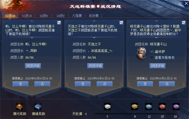 云旗猎猎震空纪,群雄争霸试锋芒 天地群雄赛正火热进行中 昨天的32进16小组赛少侠们看了么 少侠们团结一致争夺胜利的英姿太过帅气 倩倩狠狠心动了! 今天晚上还有16进8小组赛 少侠们不要错过哦! 在大赛如火如荼进行中的同时 倩倩也收到了许多少侠的精美应援图 为参加天地群雄赛的大大们打call! 构思巧妙、意境绝美 快来和倩倩一起看看吧~ 少女轻抵额头,为少侠送行 千言万语尽在不言中 祝君此去一路顺风 小河两畔,挥手作别 少侠踏上了属于他的征程 只不过还包含了诸多期盼 给与他无穷力量 身着锦衣,放孔明灯 此番天地群雄赛 看我携胜归来 市井巷陌,依依惜别 少女牵着他的手轻轻摇晃 “这次比赛,要加油啊!” 飒爽女侠摆出起手式 “备战群雄赛,我们练得还不够!” 少侠抱臂无奈 “我的好姐姐,最后一场,不能再多啦!” 悠悠天地间,携手共此时 倚背而靠,心有灵犀便一点而通 军师,你怎么看? 战场风云变幻 少侠执剑而立,眺望远方 心中战意沸腾,至死方休! 月色温柔,洒下朦胧清辉 少女仰望明月,却止不住心中热梦 摩拳擦掌,只看今朝 比赛不停,应援不止 拉拉队也很忙碌~ “就让我为诸位少侠献舞一曲” 预祝少侠们取得好成绩! 试窥天机弈有方,擂鼓动地战名扬 天地群雄赛·战况猜想正火热进行中 少侠们赶快开动脑筋分析战团情报~ 或是用过人的幸运压一压谁才是胜者吧 不论猜对猜错都可以获得精美奖励哦~ 少侠们不要错过啦! 倩倩小提醒: 战况猜想的参与时间为3月31日14:00-4月15日19:55,≥65级且修为≥20的少侠可在巨灵神或右上角雷达图附近的战况猜想入口打开猜想界面,了解并参与竞猜! 参与竞猜的少侠有机会获得河图洛书、诸天梦引、家具-疏香覆雪、青花盏宝箱、天意启灵册和15天坐骑玉冰天阁等诸多豪礼哦~ 战场烽烟起,群雄竞魁首 天地群雄赛第二轮16进8的比赛就要开始啦! 战斗到此刻的少侠无一不是三界精英 他们的对战将碰出怎样绚烂的火花 和倩倩一起期待吧! 少侠们的天地群雄赛应援图 倩倩暂且分享到这里~ 倩倩也在为少侠们加油鼓劲哦! 少侠们还有知道三界有什么好地方截图超美呢 欢迎少侠们在评论区留言 分享你的看法哦! [编辑:嫆之]