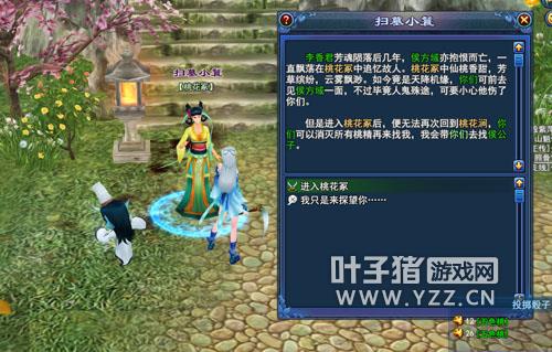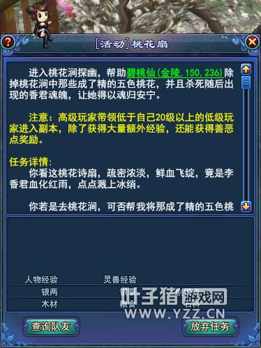 背景介绍 金陵城郊栖霞山畔的桃花涧,曾看尽金陵几朝繁华,秦淮水榭花落花飞。这桃花涧远离尘嚣,望断凡俗,李香君便是携了桃花扇隐居在此。谈起这桃花扇,另有一段荡气回肠的由来:香君抵死拒强,撞柱自杀,血染香扇,友人杨友龙妙笔绘桃花。 而今香君之魂袅袅未散,久在涧中徘徊。桃花涧中四季遍开五色桃花,浸染香君仙魂,久而久之,那些白桃儿、红桃儿、金桃儿、绛桃儿、粉桃儿也都成了精,这桃花涧中往日的一片宁静和祥被折损得只剩半分。这可如何是好? 活动时间 全天可以接受任务 活动条件 1. 参与桃花扇玩法的玩家必须大于或等于40级。 2. 玩家必须三人或三人以上组队才可以进入副本。 3. 玩家每天只可做一次。 活动流程 三人或三人以上玩家组队,在NPC碧桃仙(金陵,150,236)处接受桃花扇任务,由队长带队进入副本。 与之对话后,弹出如下对话框,可领取任务: 报名后,玩家可组队进入副本。副本的存在时间为1个小时。在进入副本后,副本中会刷出第一批20个怪,间隔一定时间后刷出下一批20个怪,一共刷出25批。 若长时间未打完刷出的桃花,则桃花会复活成为桃精,桃精会主动攻击玩家,攻击较高。 在玩家打完450个怪后,香君魂Boss会在桃花亭附近刷出。 额外奖励 通过该玩法,玩家可获得一定数值的善恶值。当队长等级大于70级,所带队员等级小于60级并与队长等级相差20级以上时,每打一个怪队长可获得善恶值,并且队长与队员都将获得额外的经验加成。 通过该玩法,玩家可通过食用桃花精们死亡时掉落的五色桃来获得一定的经验。 在香君魂Boss死亡后也会掉落一把桃花诗扇,使用后能够给玩家增加大量经验。 李香君已经升仙,玩家在进入桃花扇副本时有几率天降仙缘,进入桃花冢祭拜她。 天降仙缘 玩家在进入桃花扇副本一定时间后,有机会在副本中遇到桃花冢副本的接引npc扫墓小鬟。此时会出现一个系统提示: 与之对话可以进入桃花冢副本,桃花冢副本仙气缭绕,并且有侯方域的魂魄在其中飘荡。 全队齐心协力除去该Boss后仍将获得一把桃花诗扇。并且该Boss有更大机会掉落好的装备和物品。 在香君魂死亡后,桃花冢中将会刷出4种仙草,共计20株。采摘仙草后可获得一定数量的回复气血的药品、食品和回复法力的药品、食品。 仙草图鉴 副本介绍 桃花涧 金陵城郊的桃花涧,远离尘嚣,李香君便隐居在此。桃花涧中碧波红雨,落英缤纷。整座山涧以荷塘上片片翠叶为扇骨,细细的山径与艳丽的桃树为整幅扇面,涧中随处绽放各色桃花,身着长裙、轻挽裙摆的窈窕美女,正向你走来。看似清新明艳的风景中却蕴藏着一段凄婉壮美的桃花扇传奇…… 桃花冢 几处娇莺争碧树,花冢寒烟百卉红。桃花冢中水流潺潺,似有若无的轻雾隐隐流动。自李香君在此升仙,一段桃花扇传奇就此匿迹。这神仙也似的仙境,方是她的归处。 每周补偿 1. 如果错过了桃花扇活动(指未接任务),则上线当日领取桃花扇任务可以获得“迎头赶上(桃花扇)”状态,带有该状态参加桃花扇活动,杀怪可以获得更高的经验奖励。 2. 如果错过1天桃花扇,则获得1.8倍的经验奖励;错过连续2天或更久,则获得2.4倍。 3. 该补偿每周只能获得一次,获得该状态后再次领取任务则状态消失(即最多只有一次桃花扇活动可以享受到该经验加成)。 了解更多相关信息,请前往http://qn.yzz.cn/ [编辑:淡然]