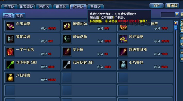 相信各位玩家在追求最新款的时装坐骑的同时,也往游戏里充值了不少元宝,还获得了商城积分的回馈。 小编在这里要提醒一下各位,根据官方消息,可用于购买如意坐骑、仓库钥匙、司母戊鼎、锦囊等好礼的下半年的商城积分将于11月14日清零,各位还留有积分的童鞋千万不要错过了,记得要尽快使用你的积分哦! 推荐阅读: