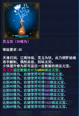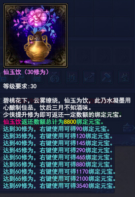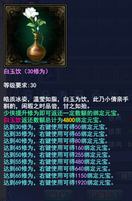 活动时间 2014年12月20日开服后—2015年1月22日8:00 活动对象 2014年12月20日开启的新服玩家 活动内容 活动期间,在新服点击主界面充值翻倍界面,点击购买按钮,在此界面成功兑换一定数额元宝,即可参与充值翻倍活动,额外1:1获得绑定元宝,1个帐号仅限1次。 充值翻倍活动一共3档,可同时参与!3档同时参与,可一共获得20400元宝,20400绑定元宝,合计40800元宝!充的越多得到优惠越大,还不赶紧行动? 活动详情 在新服点击主界面充值翻倍界面,点击购买按钮,在此界面成功兑换一定数额元宝,同时获得相应返还元宝道具。达到一定修为,即可得到一定数额绑定元宝。3档同时参与,可一共获得20400元宝,20400绑定元宝,合计40800元宝! 步骤1:点击主界面“充值翻倍”图标 步骤2:弹出“充值翻倍”活动界面,点击购买 点数充足,即可成功参与,获得绑定元宝返还道具。