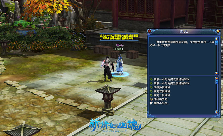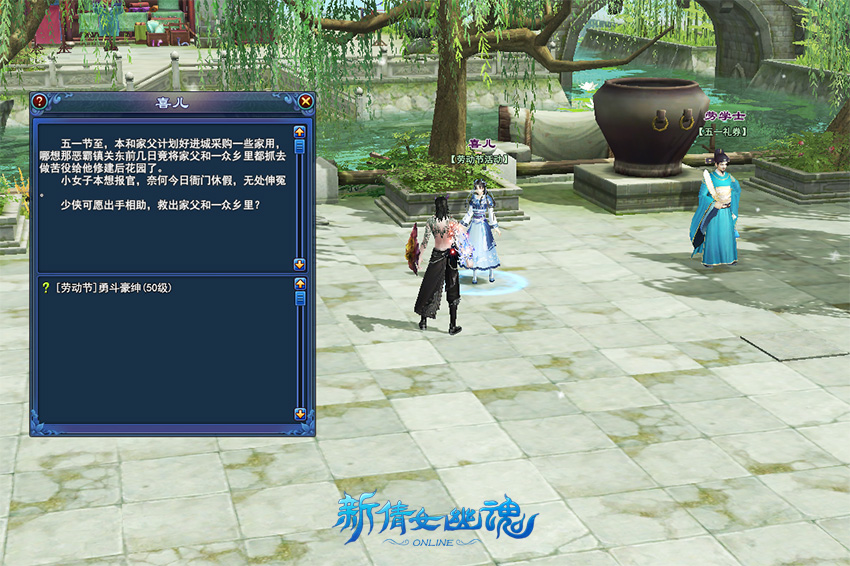 勇斗豪绅 活动背景 五一佳节至,喜儿本和父亲金老汉商量好一起去集市逛逛,不想那横行乡里的恶霸镇关东竟然强迫乡亲们给他修建后花园,喜儿父亲金老汉因为做的一收好木工活,也被抓去做了苦力,衙门今日休假喜儿只好寻求各位少侠相助。 活动时间 全服开放:2017年4月28日0:00至5月2日23:59 参与条件 角色等级大于等于50级的玩家4—6人组队。 活动流程 活动期间,大于等于50级的玩家4—6人组队前往各大主城喜儿处领取“勇斗豪绅任务”后进入后花园副本; 副本内怪物击杀经验受多倍经验影响,进入副本后可在后花园门口喜儿处领取或冻结多倍经验; 后花园内有被恶霸看守的工匠十名和金老汉; 队长可以点击每个工匠兑换后可进行营救; 点击“解救工匠”,恶霸会召唤一群恶霸前来阻拦; 保护好工匠不被恶霸攻击,击杀所有出现恶霸后才能营救下一位工匠,解救完十名工匠后最后才能解救金老汉; 解救金老汉后,恶霸镇关东上阵,打败镇关东完成任务; 从花园入口喜儿处传送出副本,提交任务,获得喜儿的谢意。