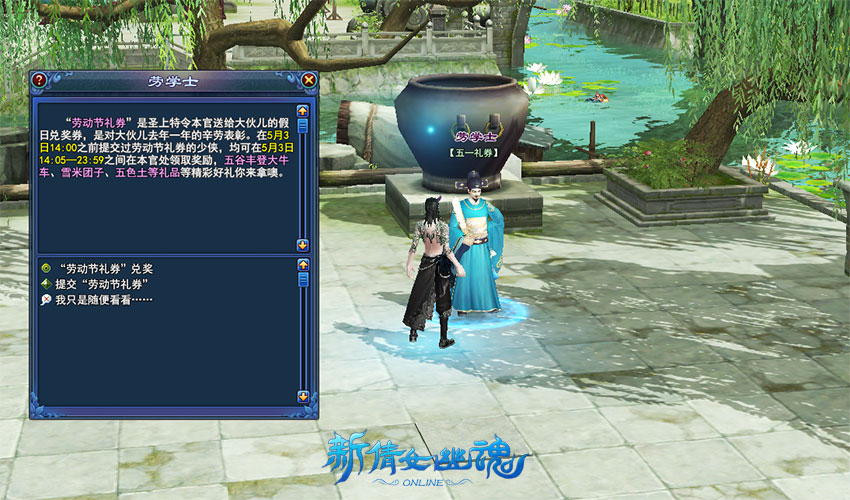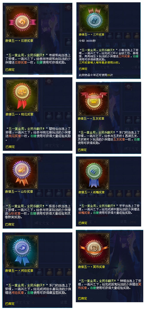 劳动节礼券 全民欢乐送、勇斗豪绅、劳模帮会竞赛均可获得劳动节礼券。获得劳动节礼券的幸运玩家务必在5月3日14:00前,将礼券提交至杭州劳学士(173,302)处,提交过礼券的玩家可在5月3日14:05后领取奖励哟。 这些奖励包括:五谷丰登大牛车、雪米团子、五色土、宝匣钥匙、十诫锦囊、九霞锦囊、5级红色金刚钻、5级蓝色金刚钻、5级金刚钻碎片等。 劳动节头饰、挂饰和坐骑 全民欢乐送、勇斗豪绅、劳模帮会竞赛均可获得六角风车和耕犁。